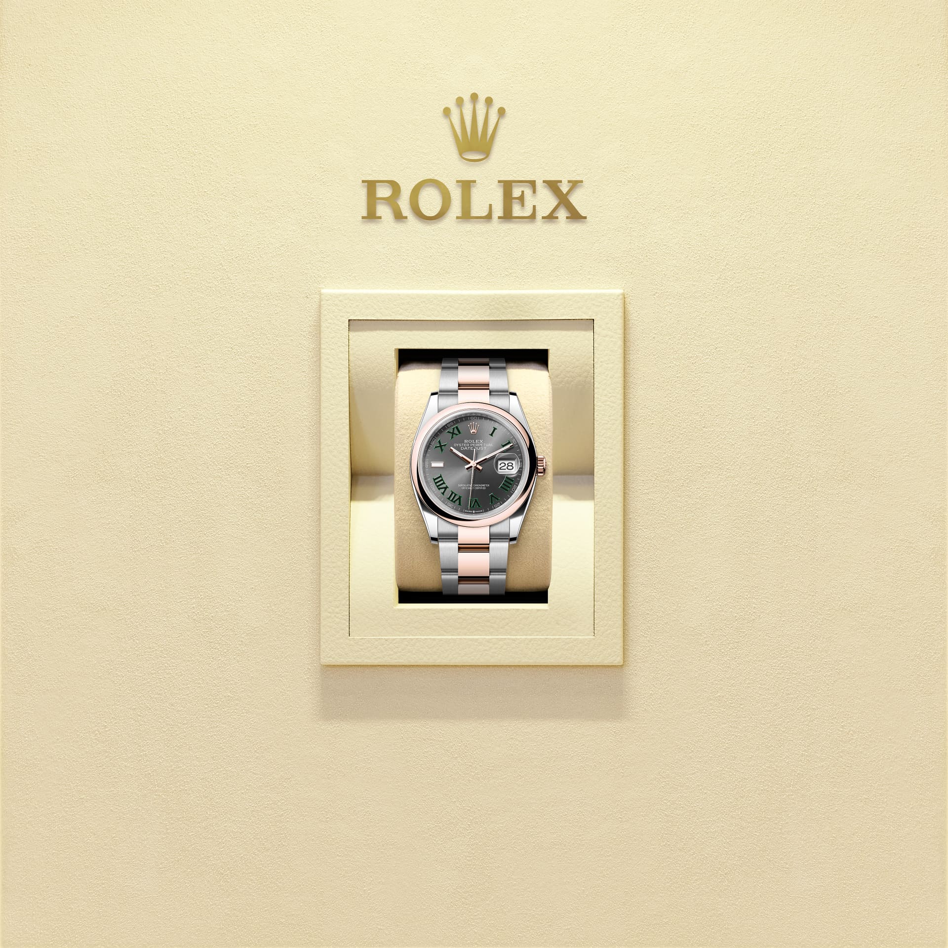 تتميز ساعة أويستر بربتشوال ديت جست ٣٦ هذه المصنوعة من فولاذ أويستر ستيل وذهب إيفروز بمينا رمادي داكن وبسوار أويستر.