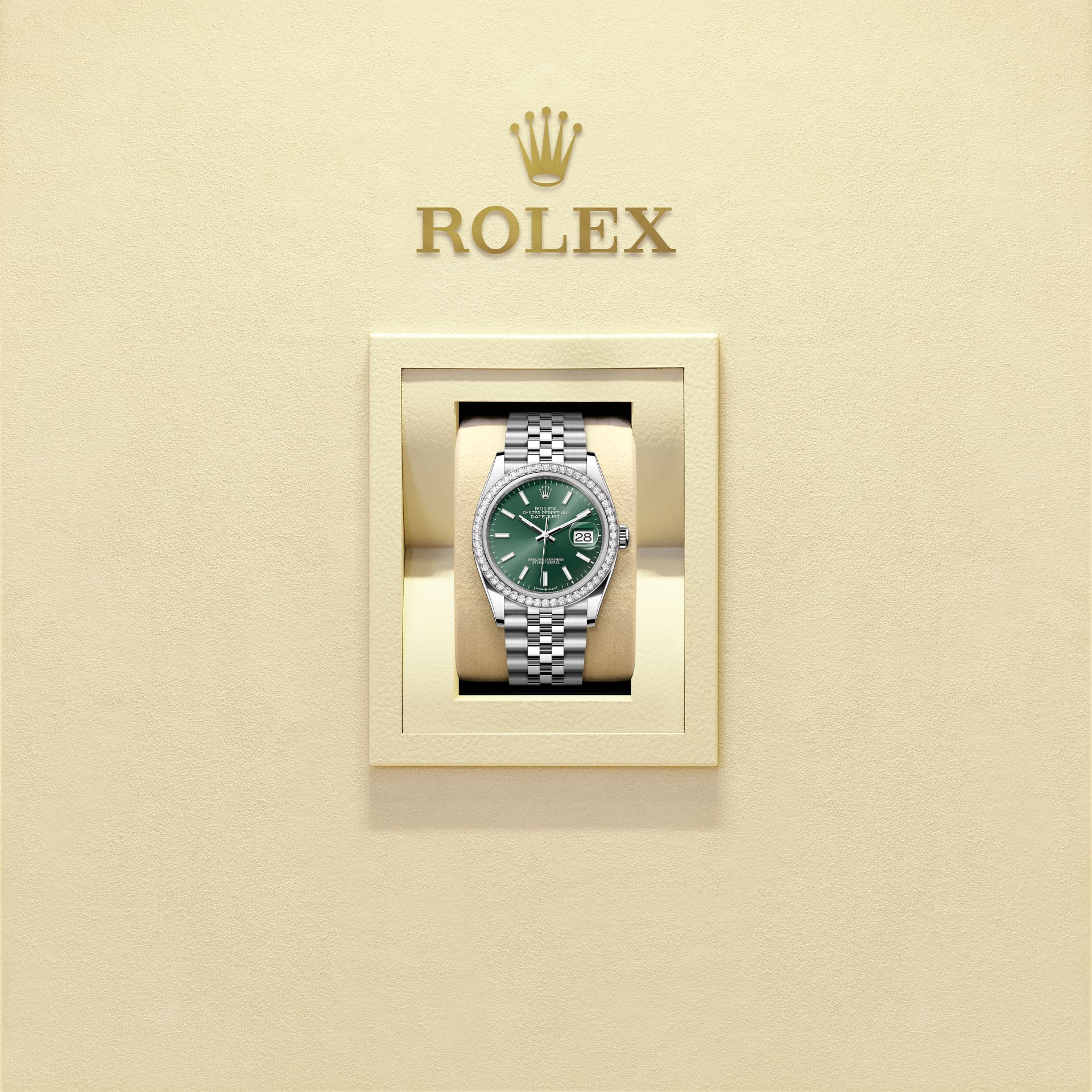 تتميز ساعة أويستر بربتشوال ديت جست ٣٦ هذه المصنوعة من فولاذ أويستر ستيل والذهب الأبيض بمينا أخضر نعناعي وبسوار جوبيلي (Jubilee).
