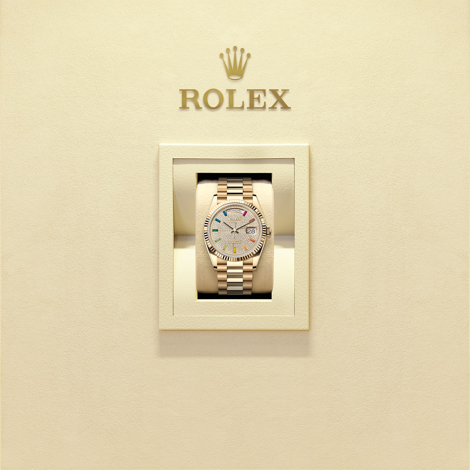 تتميز ساعة أويستر بربتشوال داي ديت ۳٦ المصنوعة من ذهب أصفر عيار ١٨ قيراطًا بمينا مرصوف بالألماس وبإطار مُخدّد وبسوار بريزيدانت (President).
