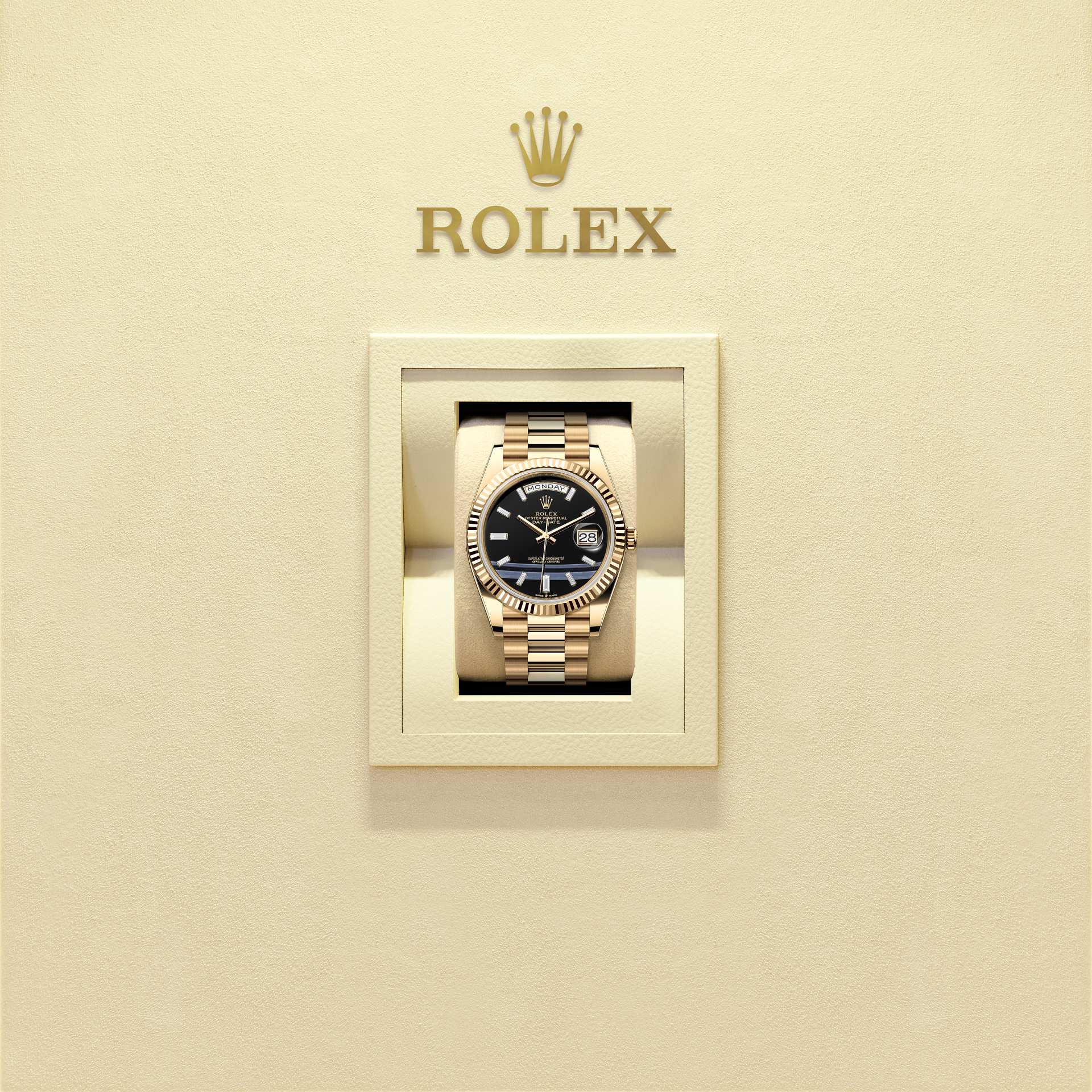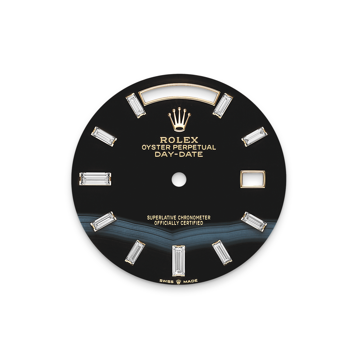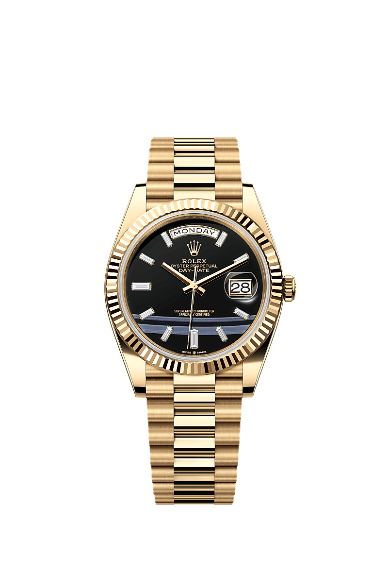 تتميز ساعة أويستر بربتشوال داي ديت ٤٠ المصنوعة من ذهب أصفر عيار ١٨ قيراطًا بمينا لون الجَزع، مُرصّع بالألماس وبإطار مُخدّد وبسوار بريزيدانت (President).
