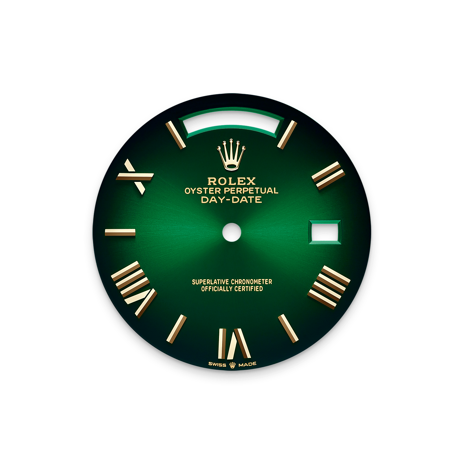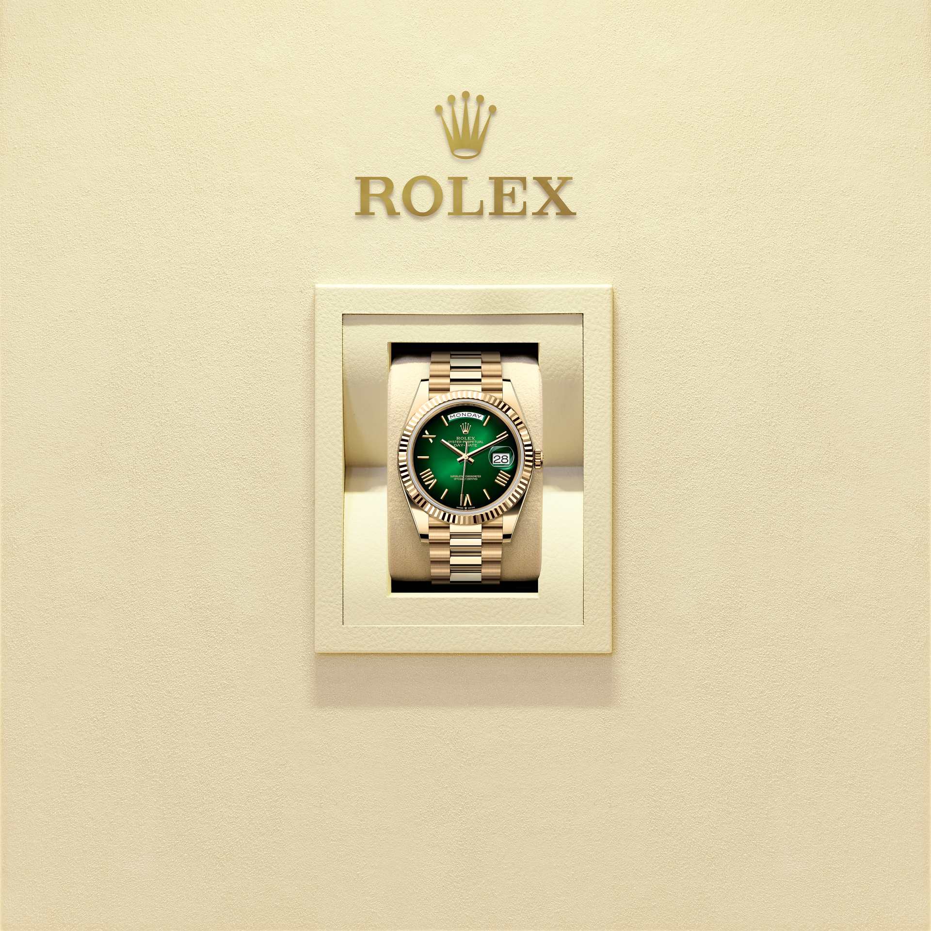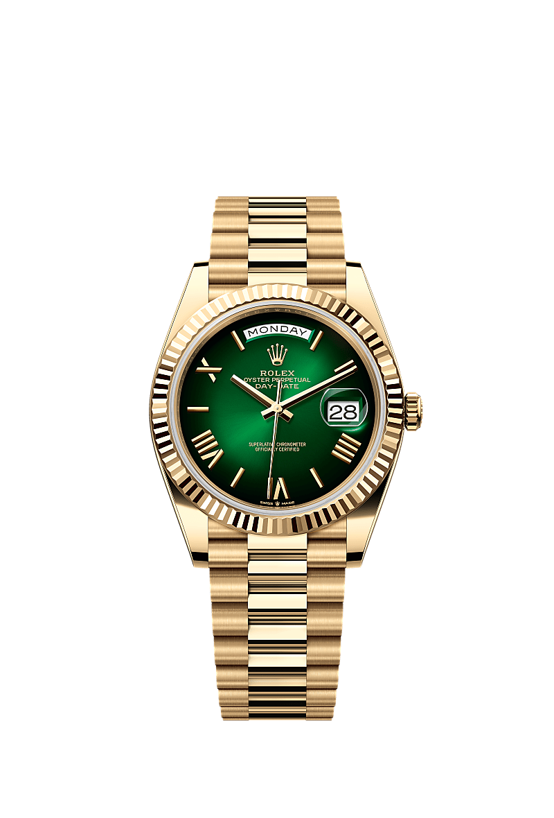 تتميز ساعة أويستر بربتشوال داي ديت ٤٠ المصنوعة من ذهب أصفر عيار ١٨ قيراطًا بمينا أخضر مُضلَّل وبإطار مُخدّد وبسوار بريزيدانت (President).