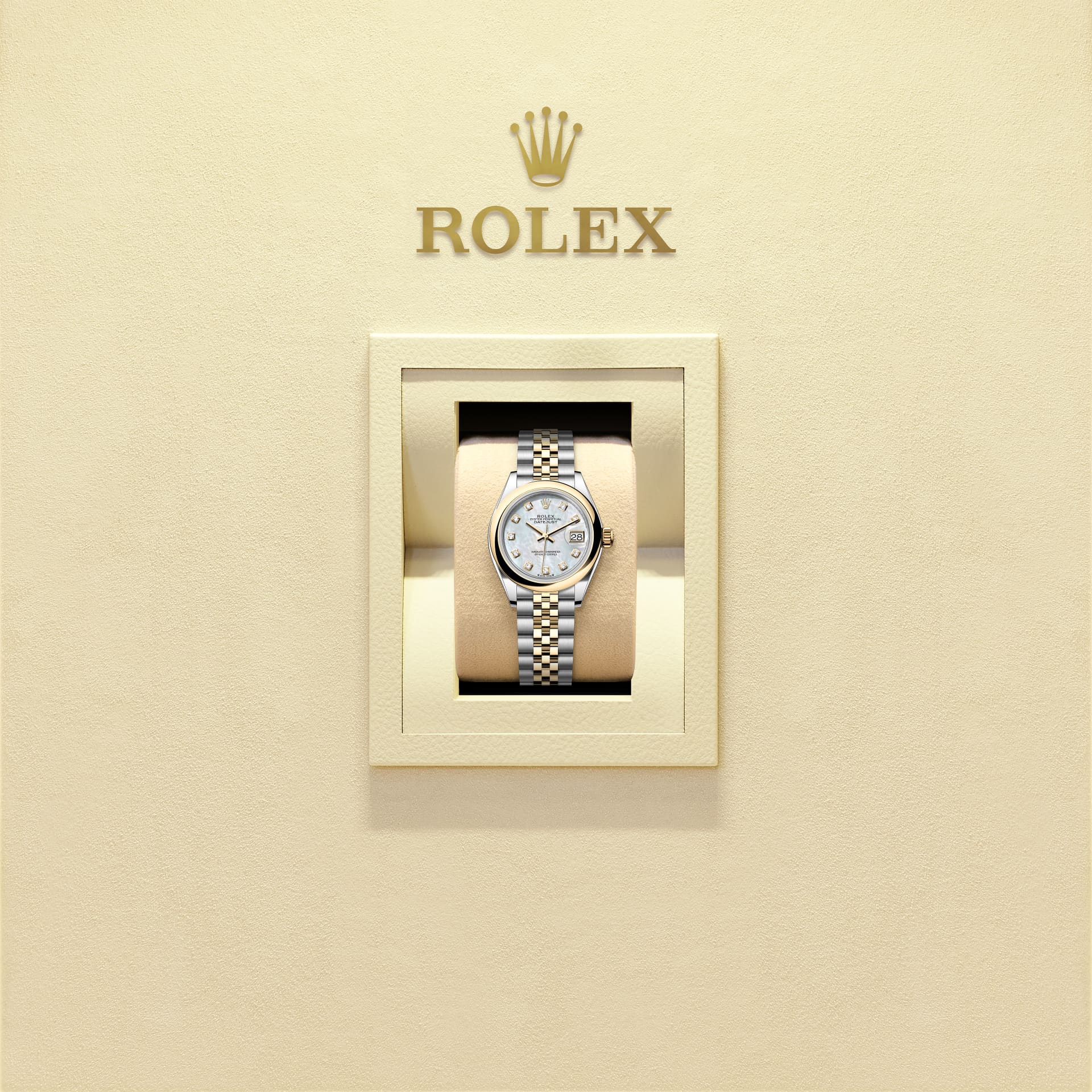 تتميز ساعة أويستر بربتشوال ليدي ديت جست هذه المصنوعة من فولاذ أويستر ستيل والذهب الأصفر بمينا من عرق اللؤلؤ الأبيض مُرصّع بالألماس وبسوار جوبيلي (Jubilee).