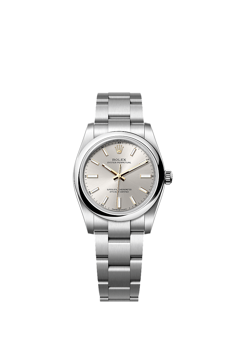 ساعة أويستر بربتشوال ٣٤ من فولاذ أويستر ستيل مجهّزة بمينا فضي وسوار أويستر.