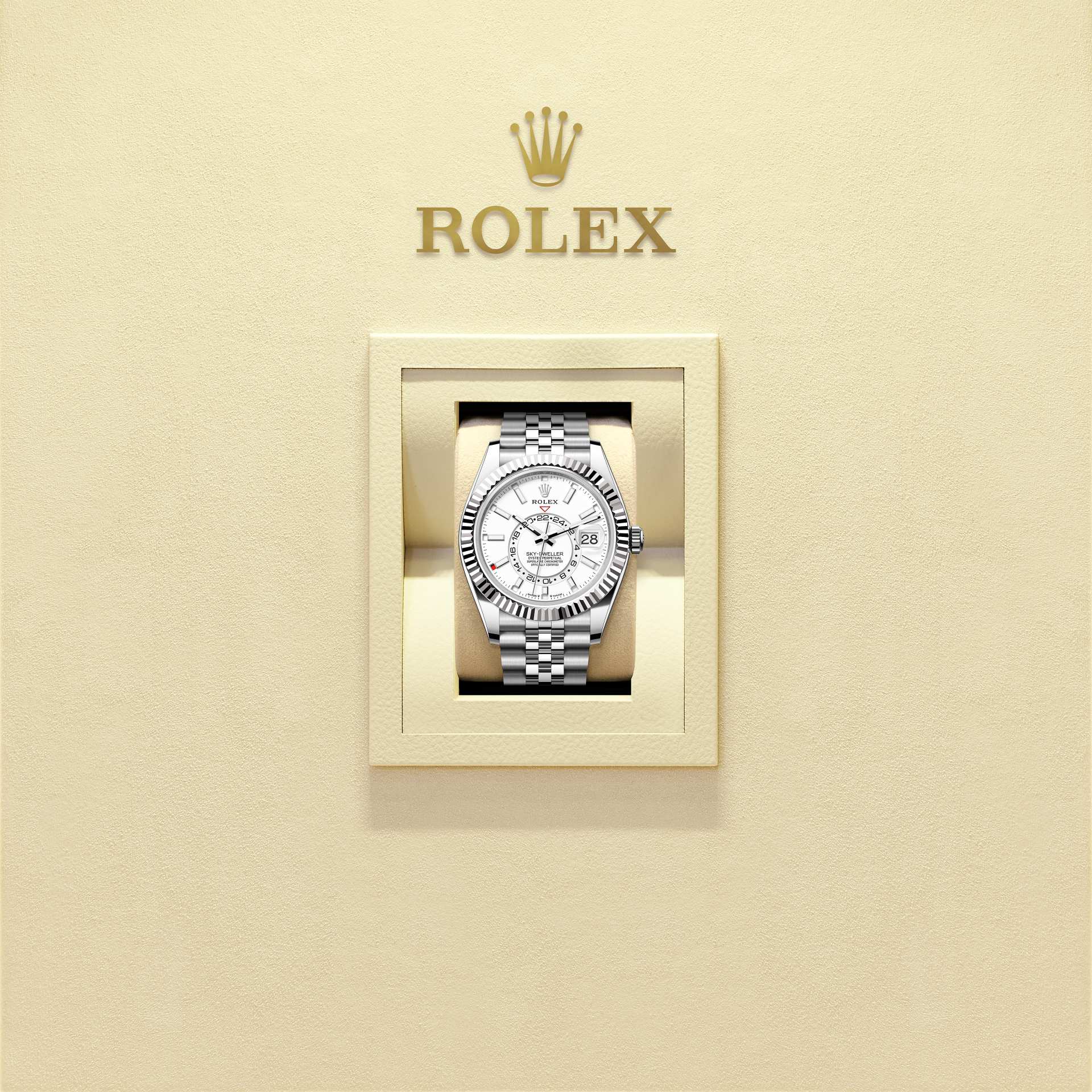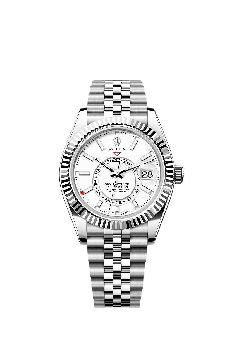 تتميز ساعة أويستر بربتشوال سكاي دويلَر المصنوعة من فولاذ أويستر ستيل والذهب الأبيض بمينا أبيض ناصع وبسوار جوبيلي (Jubilee).