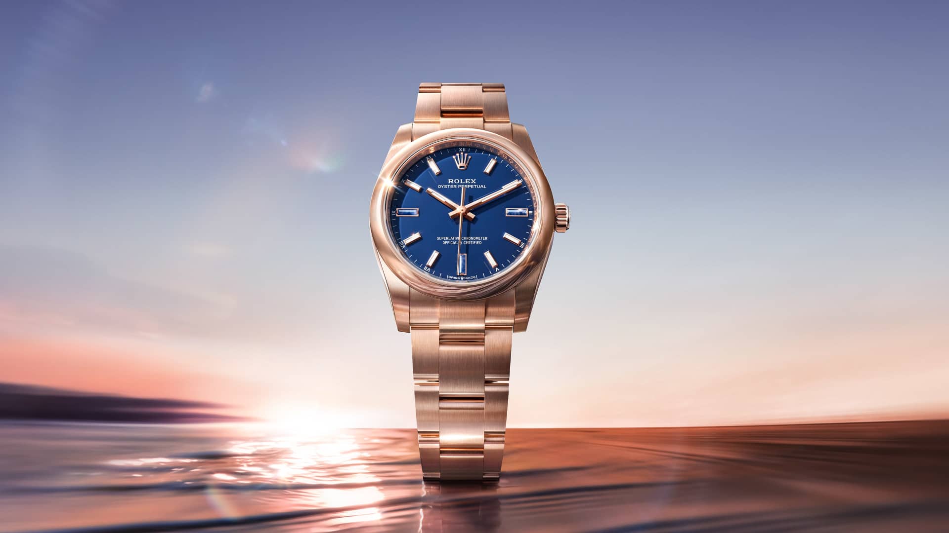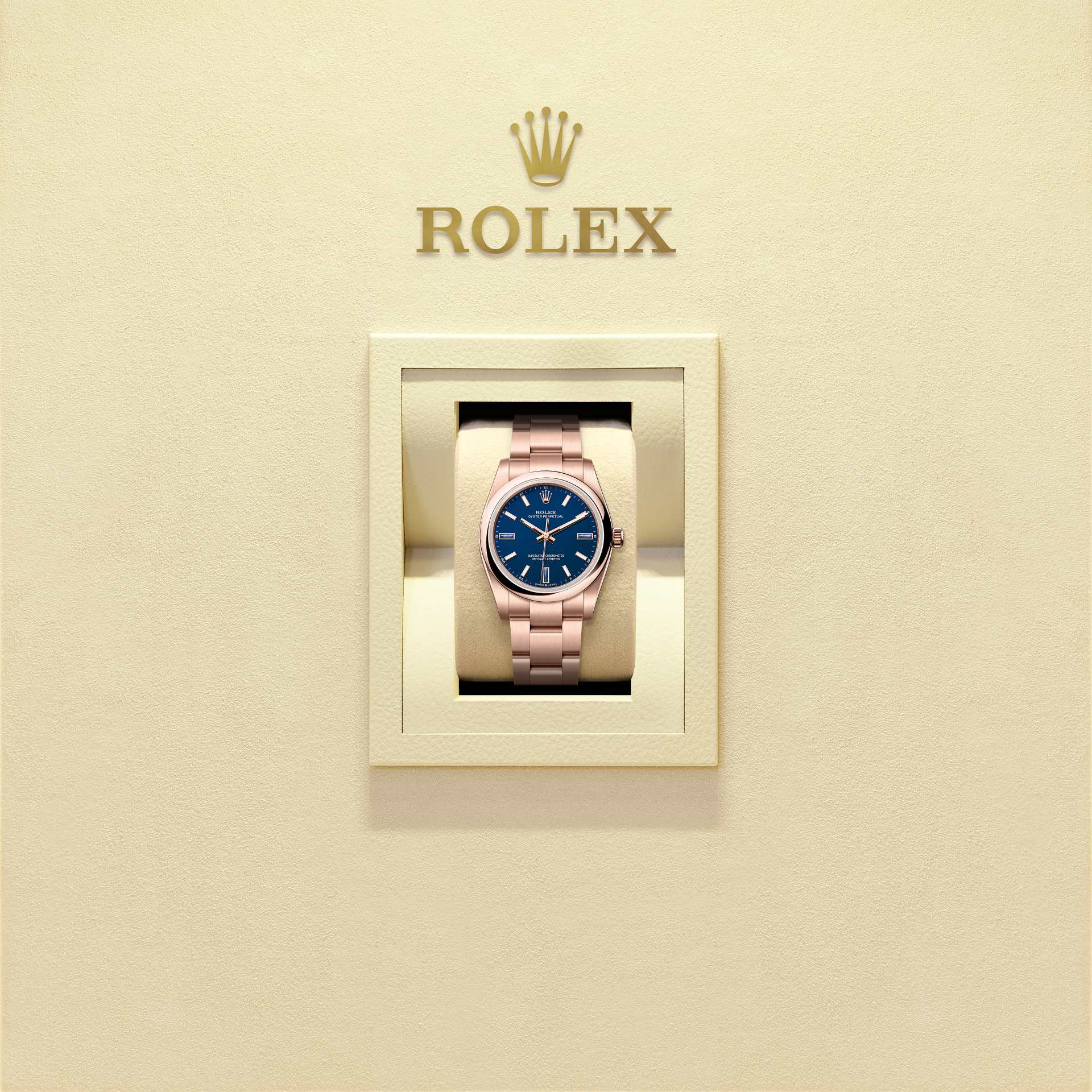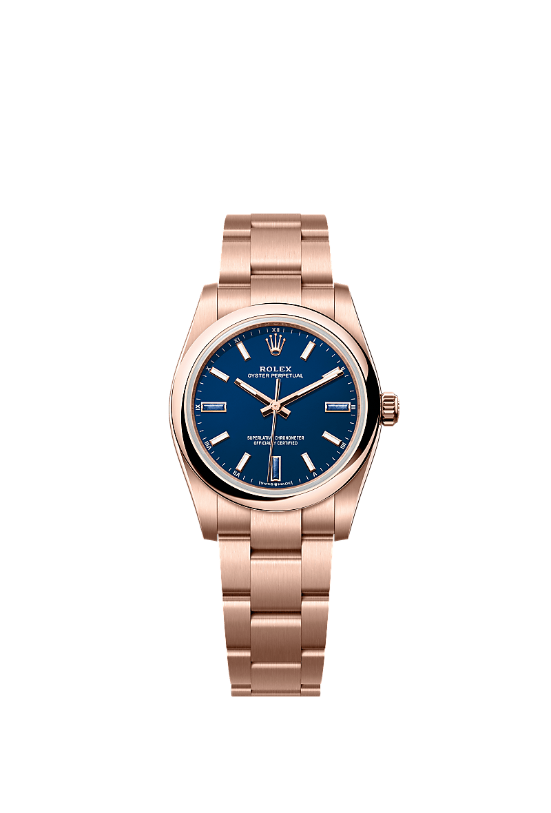 Die Oyster Perpetual 34 in 18 Karat Everose-Gold mit Zifferblatt in Blue stone und Oyster-Band.