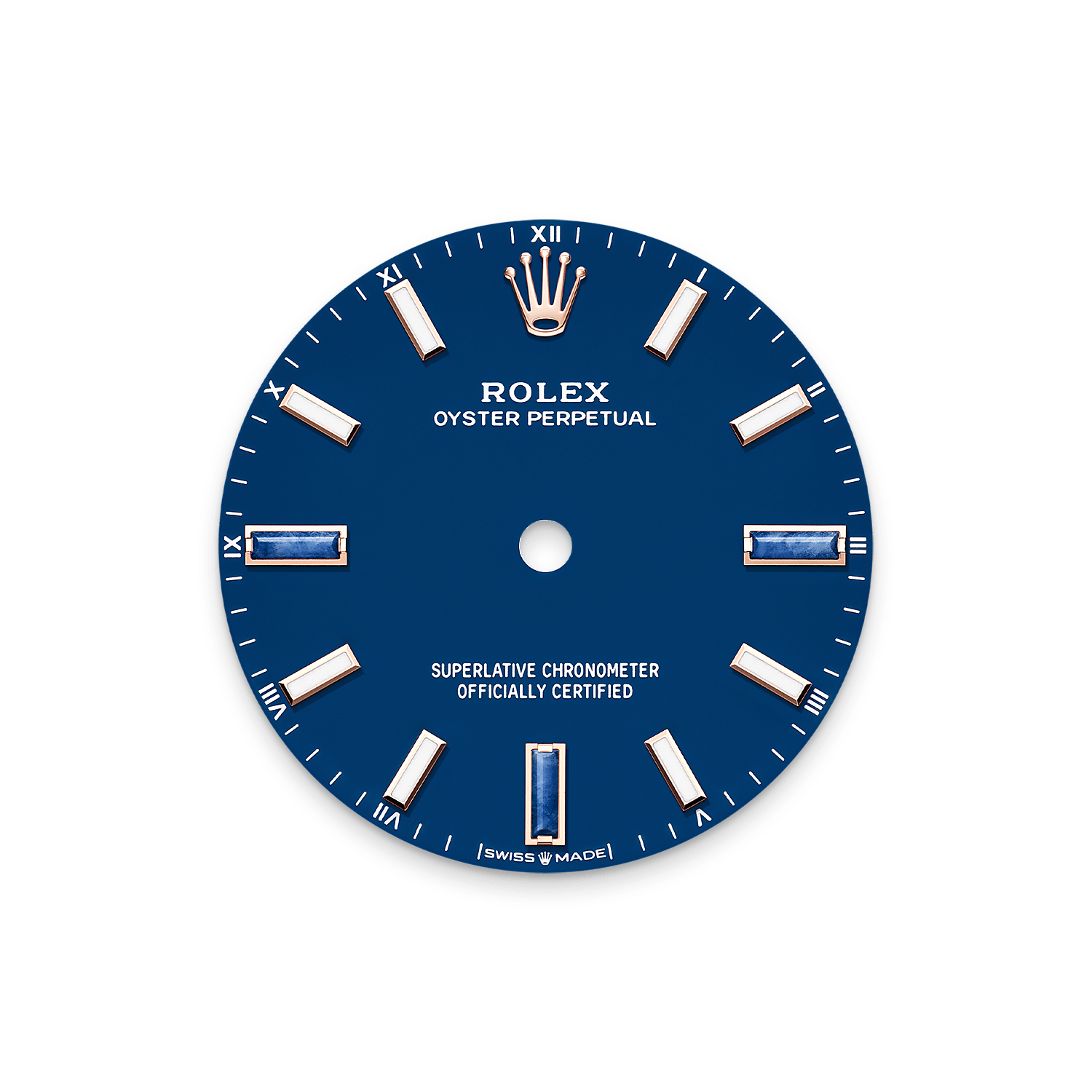 Das Modell verfügt über ein lackiertes Zifferblatt in Blue stone mit drei Indizes – jenen auf der 3‑, 6‑ und 9‑Uhr-Position – aus Dumortierit, einem Mineral, das durch abwechselnd hell- und dunkelblaue Bereiche gekennzeichnet ist.