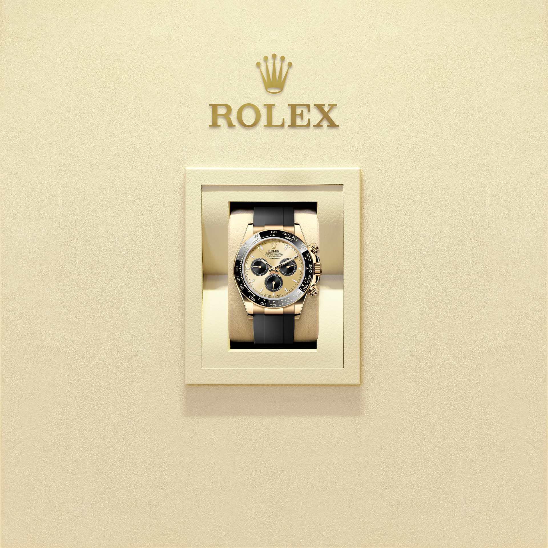 Die Ausführung des Cosmograph Daytona in 18 Karat Gold mit Cerachrom-Lünette verfügt über ein Oysterflex-Band. Dieses von Rolex entwickelte, patentierte Armband verbindet auf einzigartige Weise die Robustheit eines Metallarmbandes mit dem Tragekomfort eines Elastomerbandes.