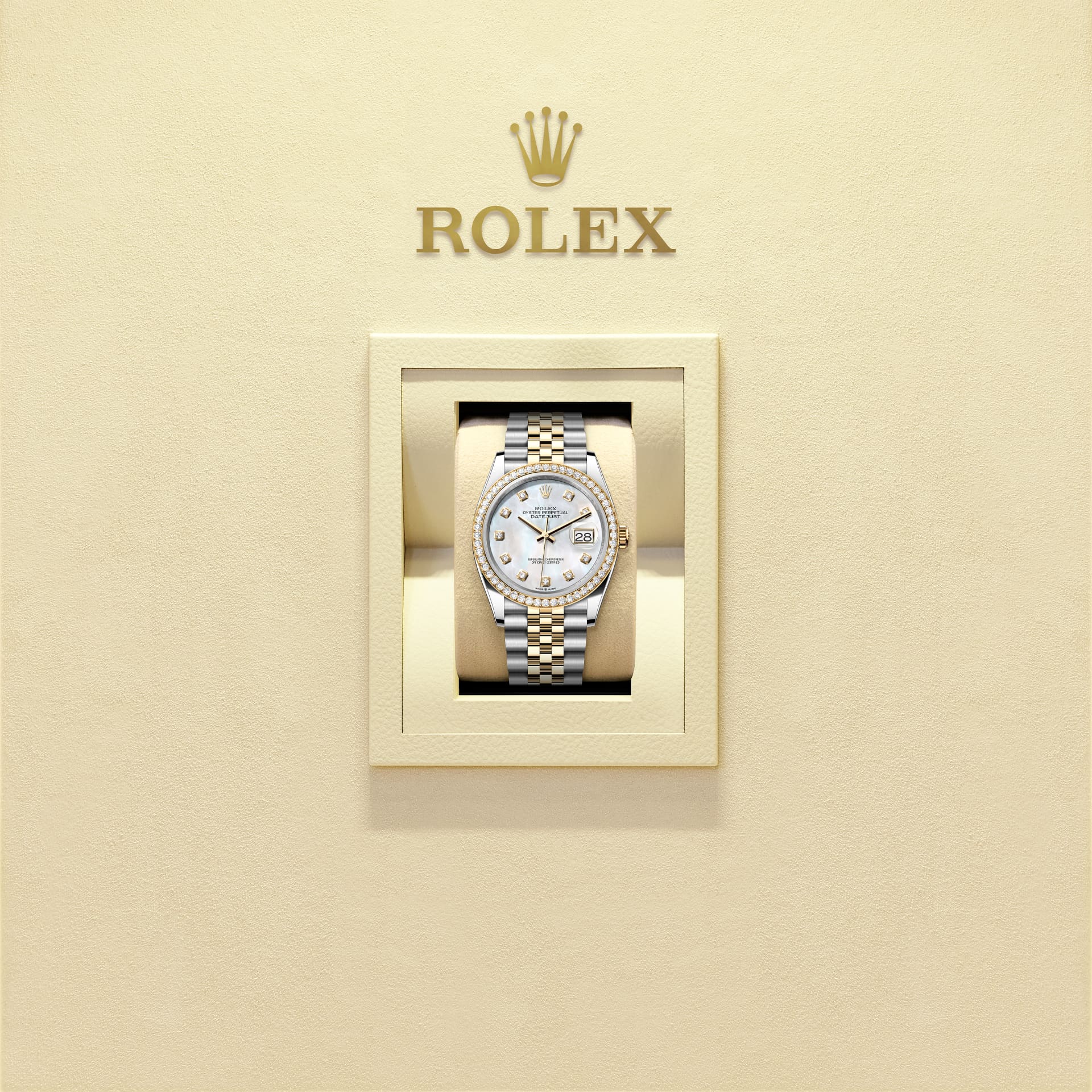 Oyster Perpetual Datejust 36 in Edelstahl Oystersteel und Gelbgold. Zifferblatt in hellem Perlmutt mit Diamanten. Armband: Jubilee-Band.