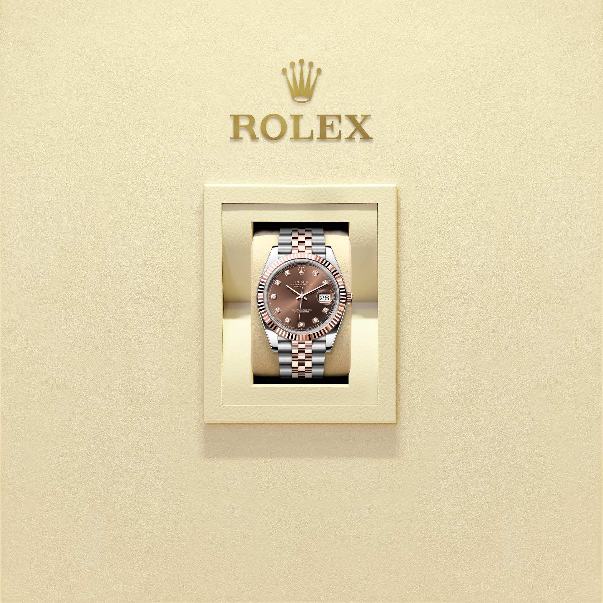 Oyster Perpetual Datejust 41 in Edelstahl Oystersteel und Everose-Gold. Zifferblatt in Schokoladenfarben mit Diamanten. Armband: Jubilee-Band.