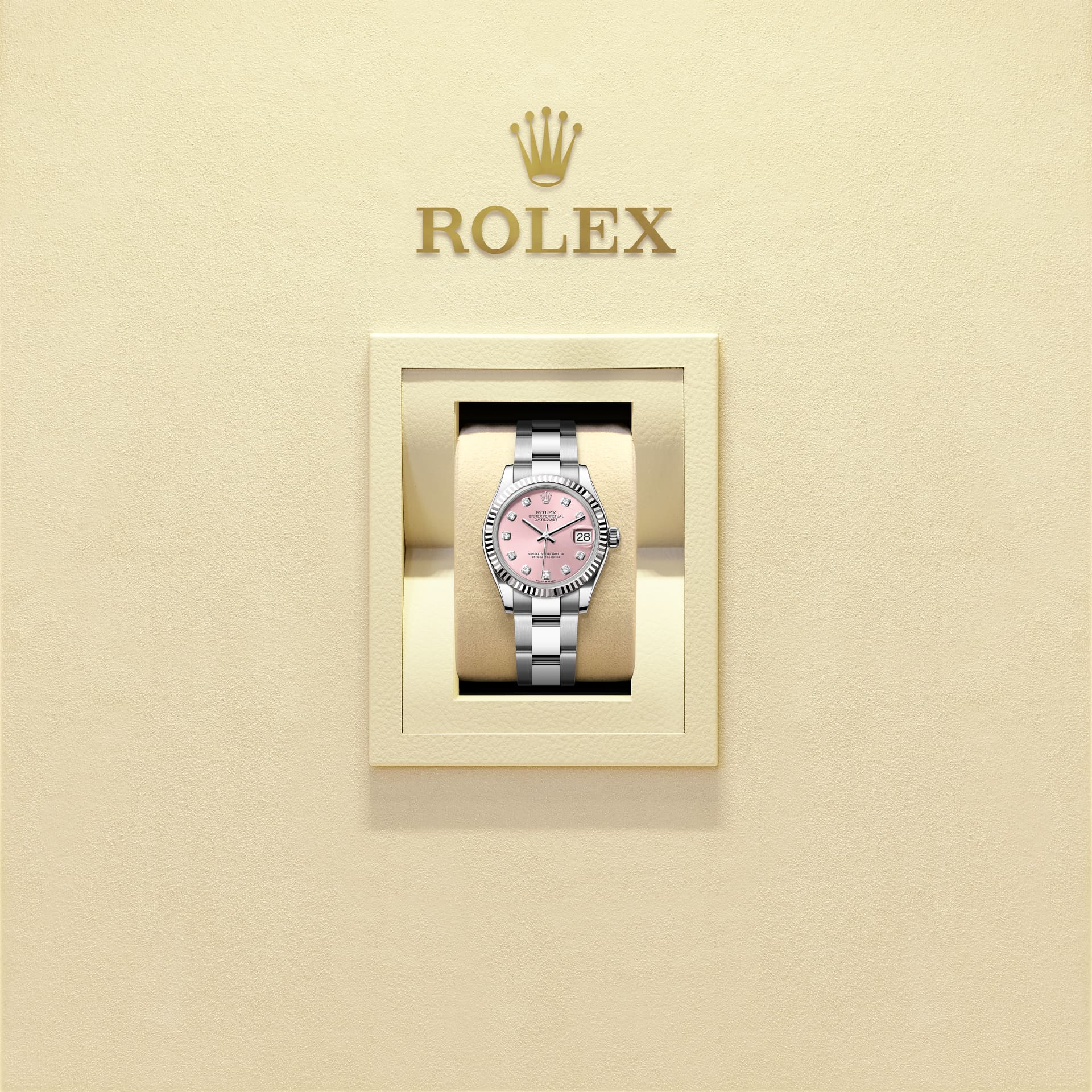 Oyster Perpetual Datejust 31 in Edelstahl Oystersteel und Weißgold. Zifferblatt in Roséfarben mit Diamanten. Armband: Oyster-Band.
