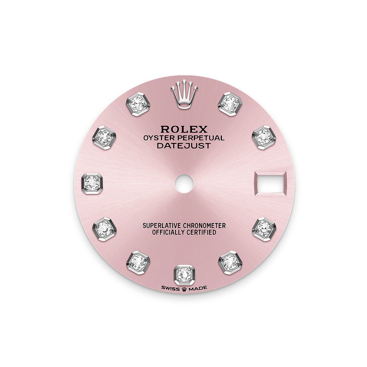 Dieses Zifferblatt verfügt über Diamanten, Fassung 18 Karat Gold. Der Radialschliff lässt zarte Lichtreflexe auf vielen Zifferblättern der Oyster Perpetual Kollektion entstehen. Er umfasst virtuose Bürsttechniken, mit denen Riffelungen erzeugt werden, die von der Mitte des Zifferblatts her ausstrahlen.