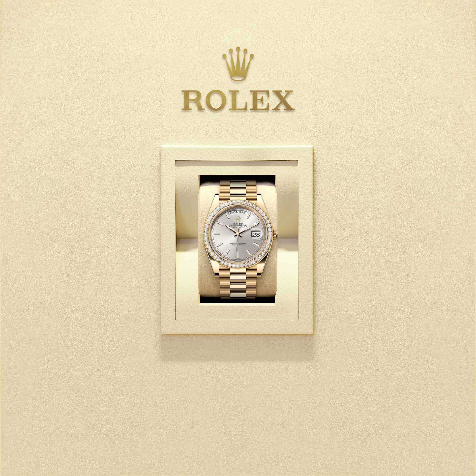 Oyster Perpetual Day-Date 40 in 18 Karat Gelbgold mit Zifferblatt in Silbern. Lünette: Diamantlünette. Armband: President-Band.