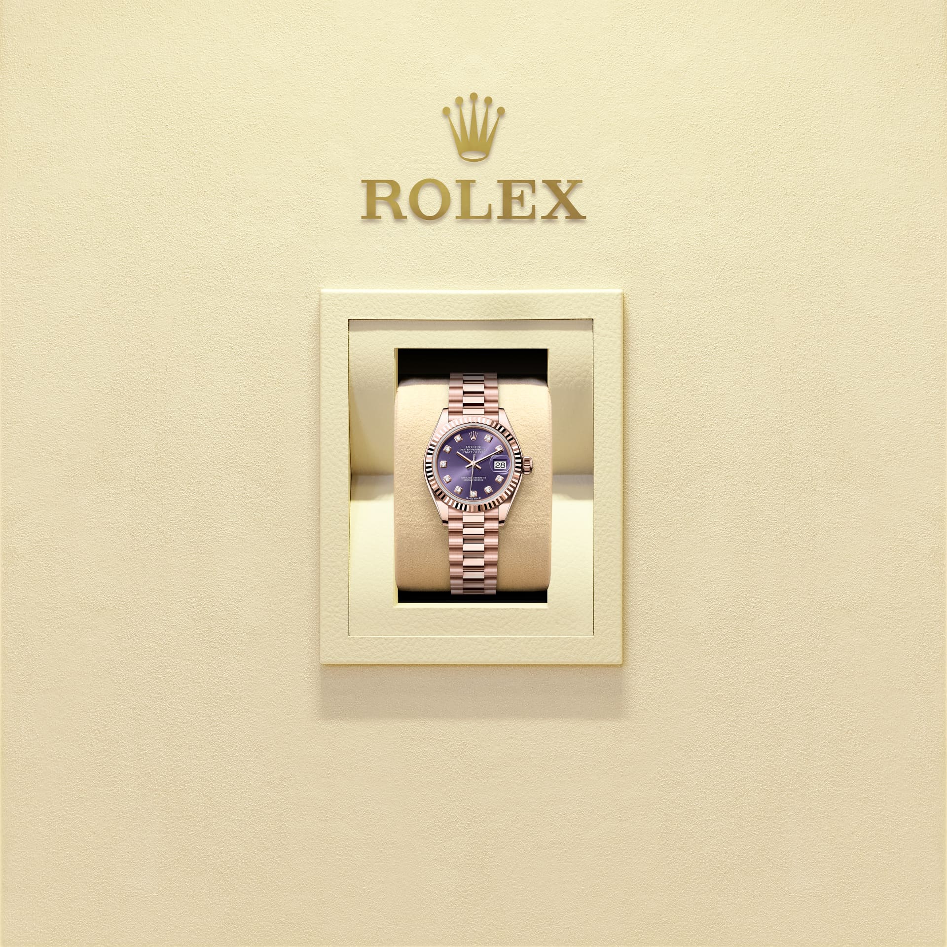 Oyster Perpetual Lady-Datejust in 18 Karat Everose-Gold. Zifferblatt: Auberginefarben mit Diamanten. Armband: President.