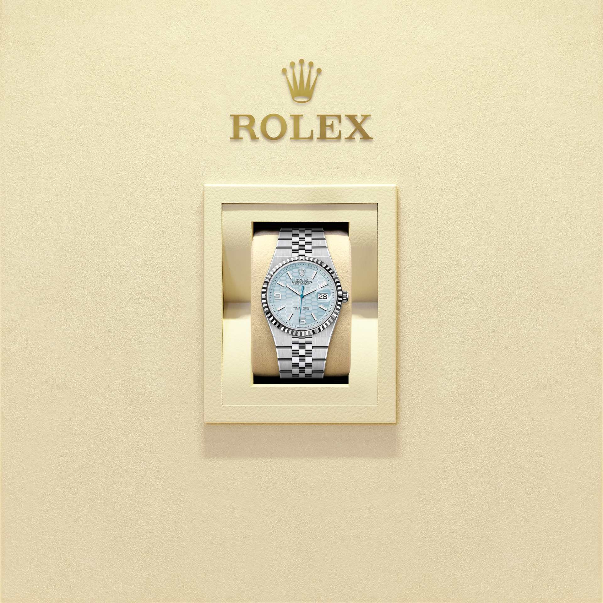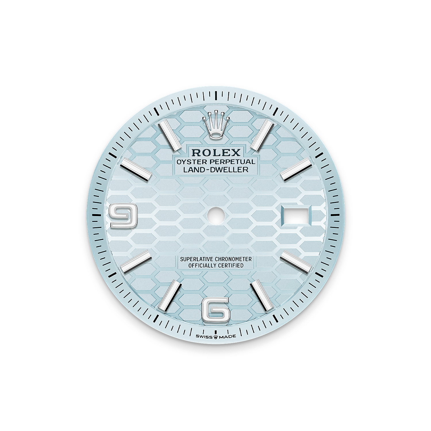 Die Land-Dweller 36 in Platin mit Zifferblatt in Eisblau mit Wabenmuster und Flat Jubilee-Band.