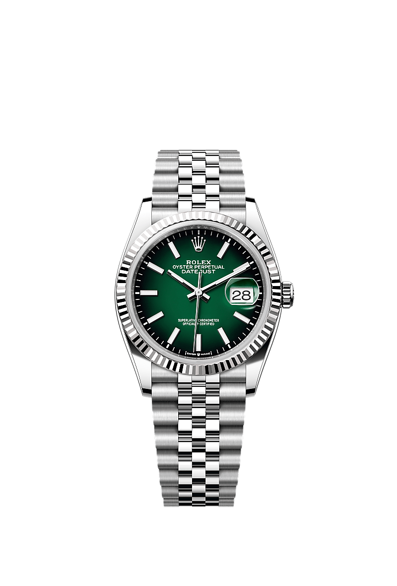 This Oyster Perpetual Datejust 36 in Oystersteel and white gold features a green ombré dial and a Jubilee bracelet.