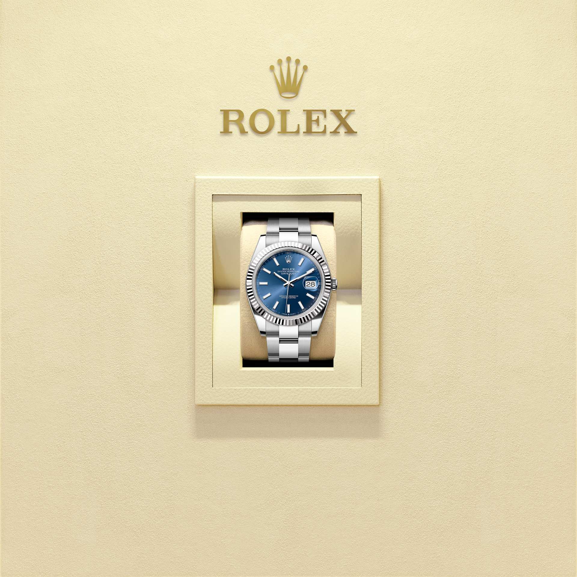 This Oyster Perpetual Datejust 41 in Oystersteel and white gold features a bright blue dial and an Oyster bracelet.