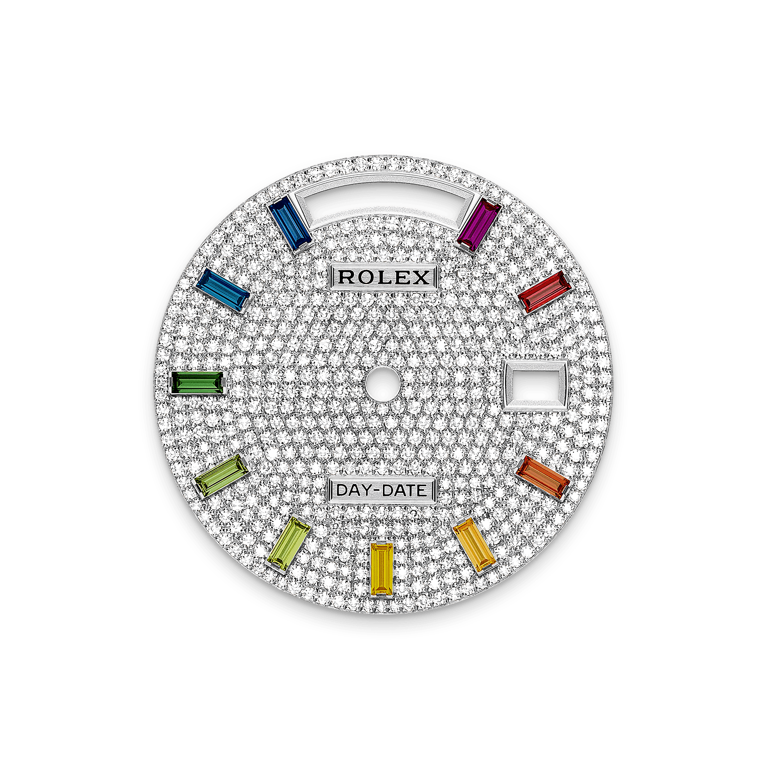 This dial features 10 baguette-cut, rainbow-coloured sapphires. Diamonds, sapphires, rubies, emeralds – the noblest and most precious stones are selected to grace Rolex timepieces. The brand has in-house expertise and equipment enabling it to bejewel any model in its catalogue.