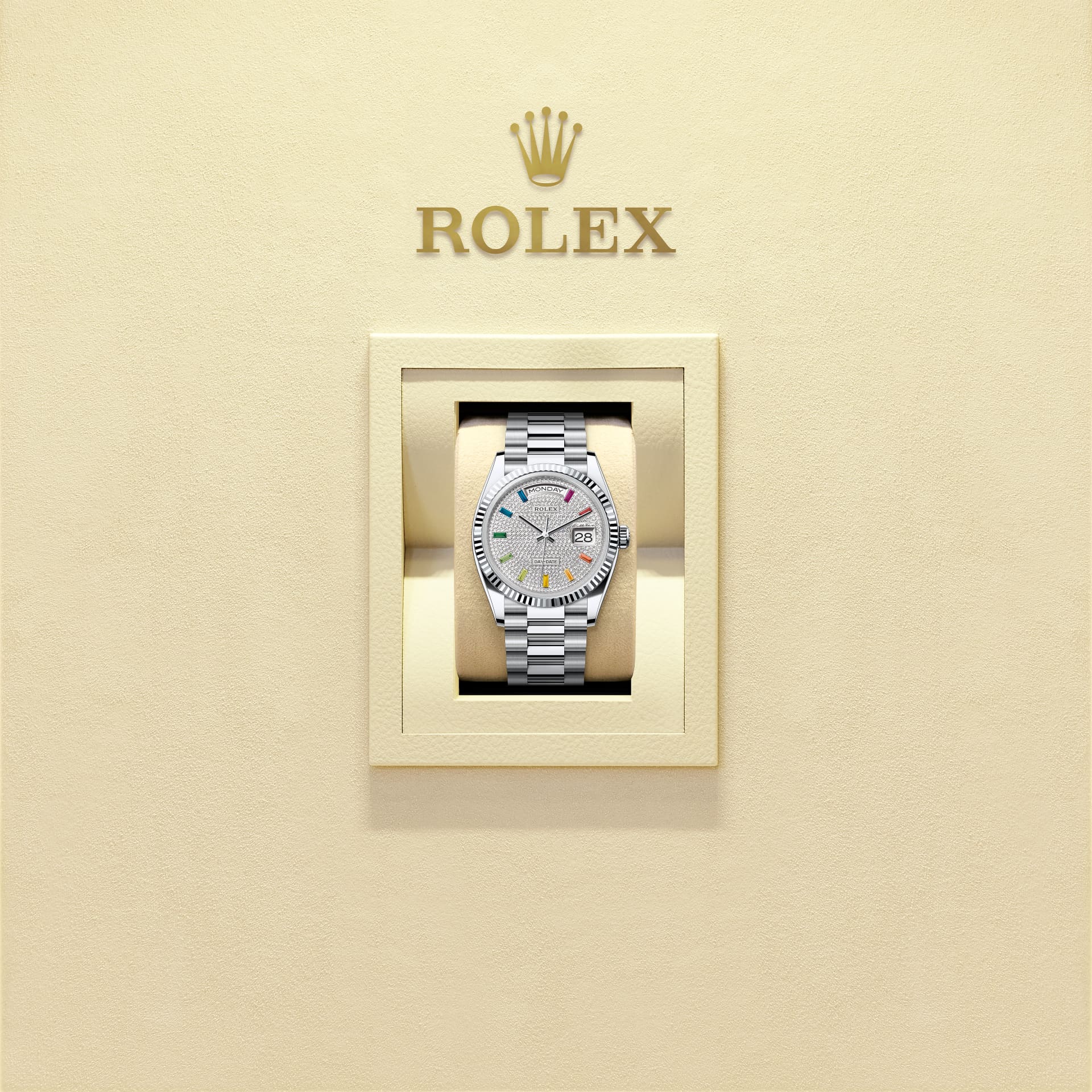 The Oyster Perpetual Day-Date 36 in platinum with a diamond-paved dial, fluted bezel and a President bracelet.