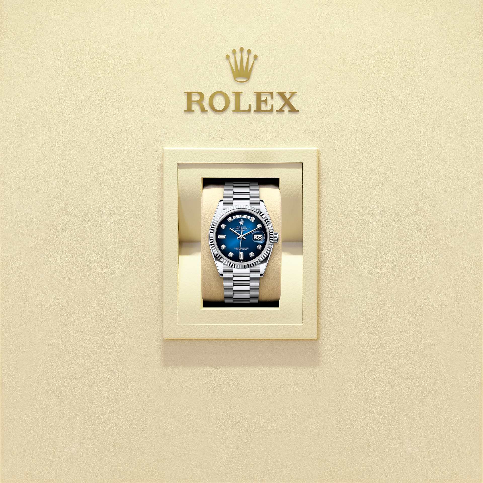 The Oyster Perpetual Day-Date 36 in platinum with a blue ombré, diamond-set dial, fluted bezel and a President bracelet.