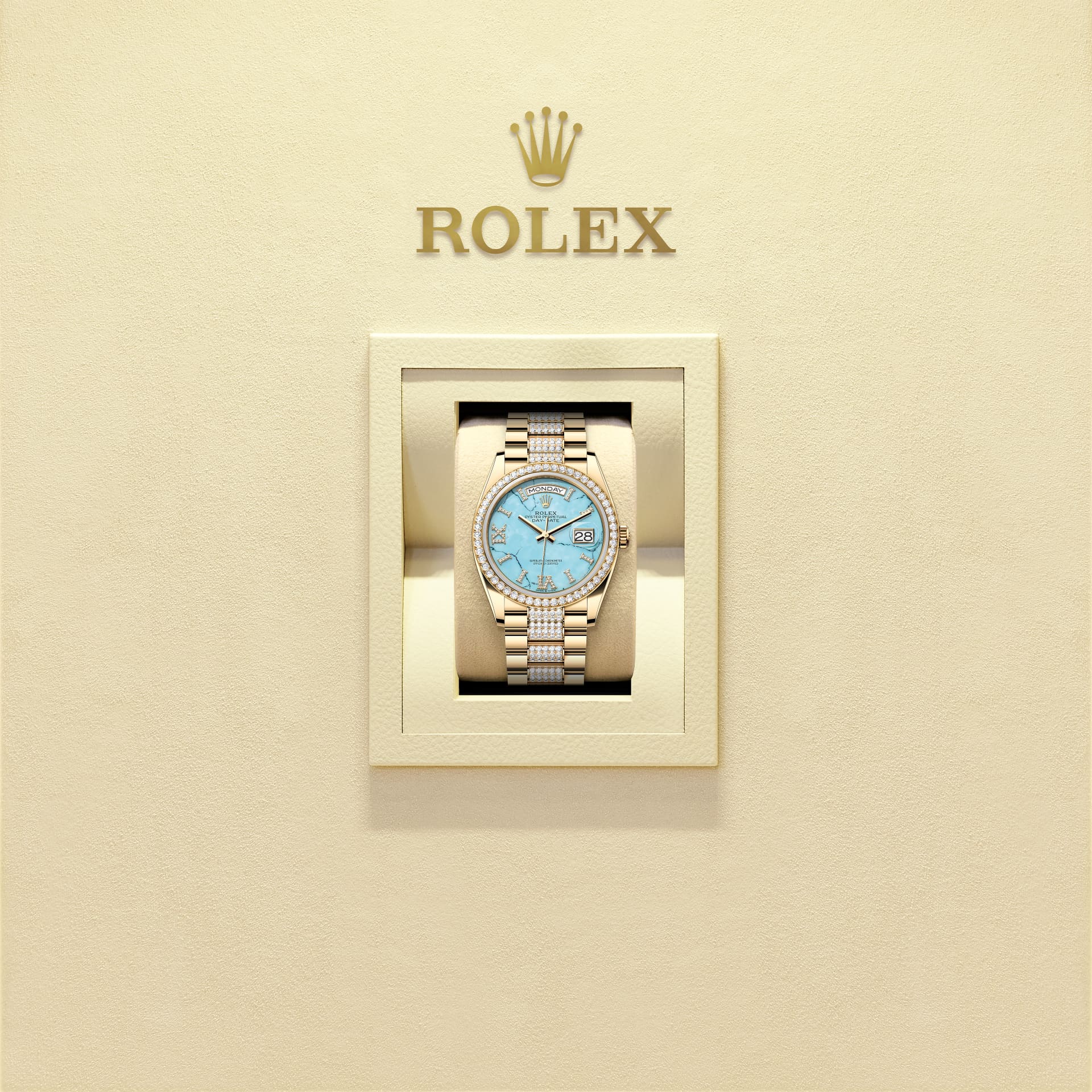 Only found in a few places on Earth, turquoise has been prized for thousands of years for its special hue. Rolex selects turquoise for the beauty of its structure and its characteristic, rare blue colour, because it marries perfectly with yellow and white gold. It is exclusively reserved for gold or platinum versions of the Day-Date 36.