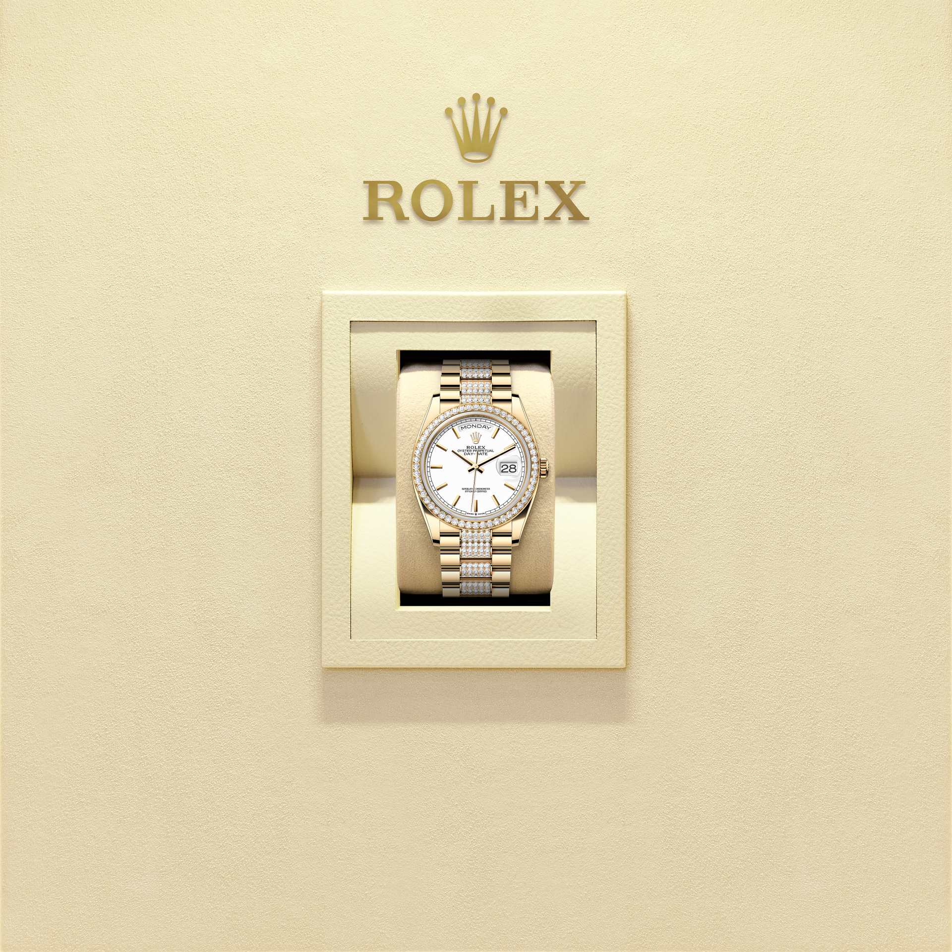 The Oyster Perpetual Day-Date 36 in 18 kt yellow gold with a white dial, diamond-set bezel and a diamond-set President bracelet.