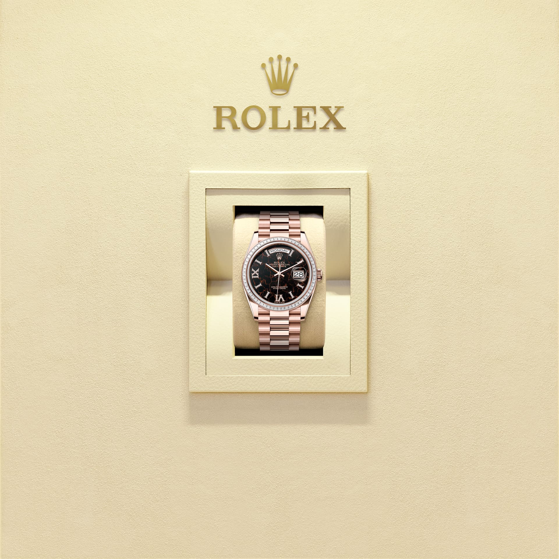 This dial features hour markers in 18 kt gold, set with 32 diamonds, and a Roman VI and IX in 18 kt gold, set with 24 diamonds. The Oyster Perpetual Day-Date 36 is presented with a dial made from eisenkiesel, a deep brown decorative stone used by the brand for the first time in 2021.