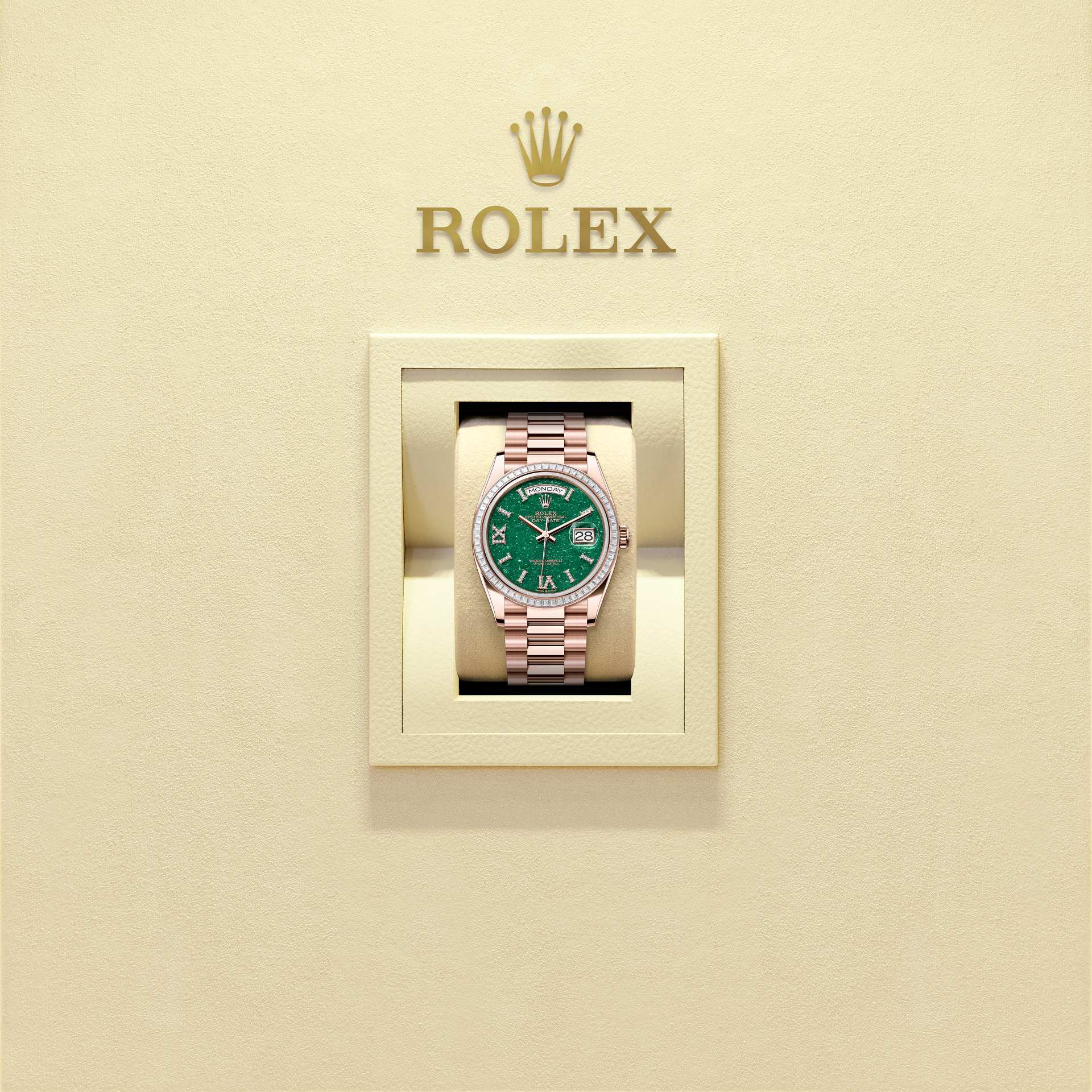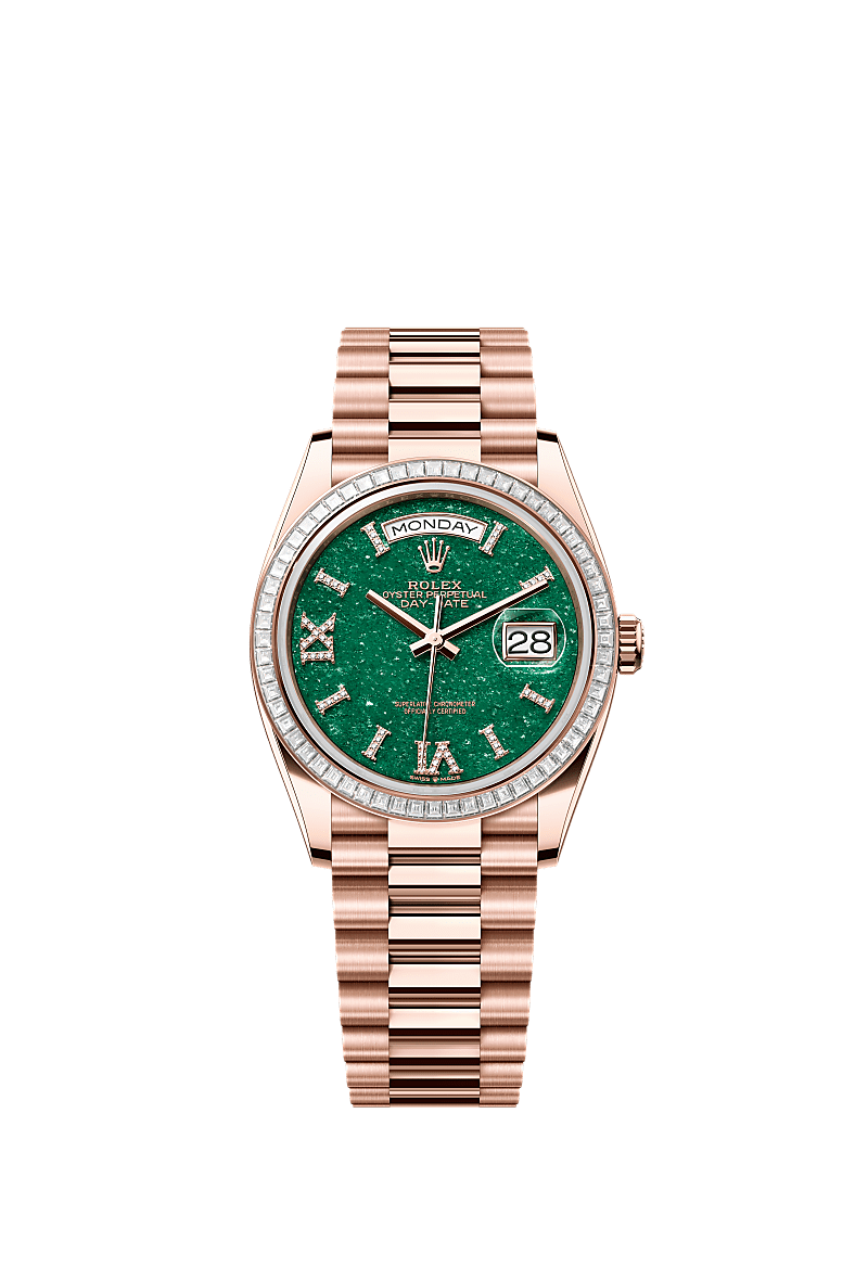 The Oyster Perpetual Day-Date 36 in 18 kt Everose gold, with a green aventurine, diamond-set dial, diamond-set bezel and a President bracelet.
