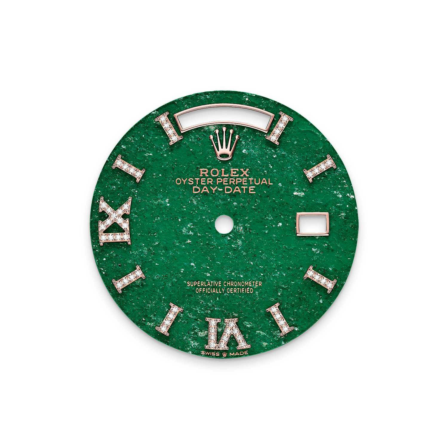 This dial features hour markers in 18 kt gold, set with 32 diamonds, and a Roman VI and IX in 18 kt gold, set with 24 diamonds. It is cut from green aventurine, a stone with a finely crystallized surface.