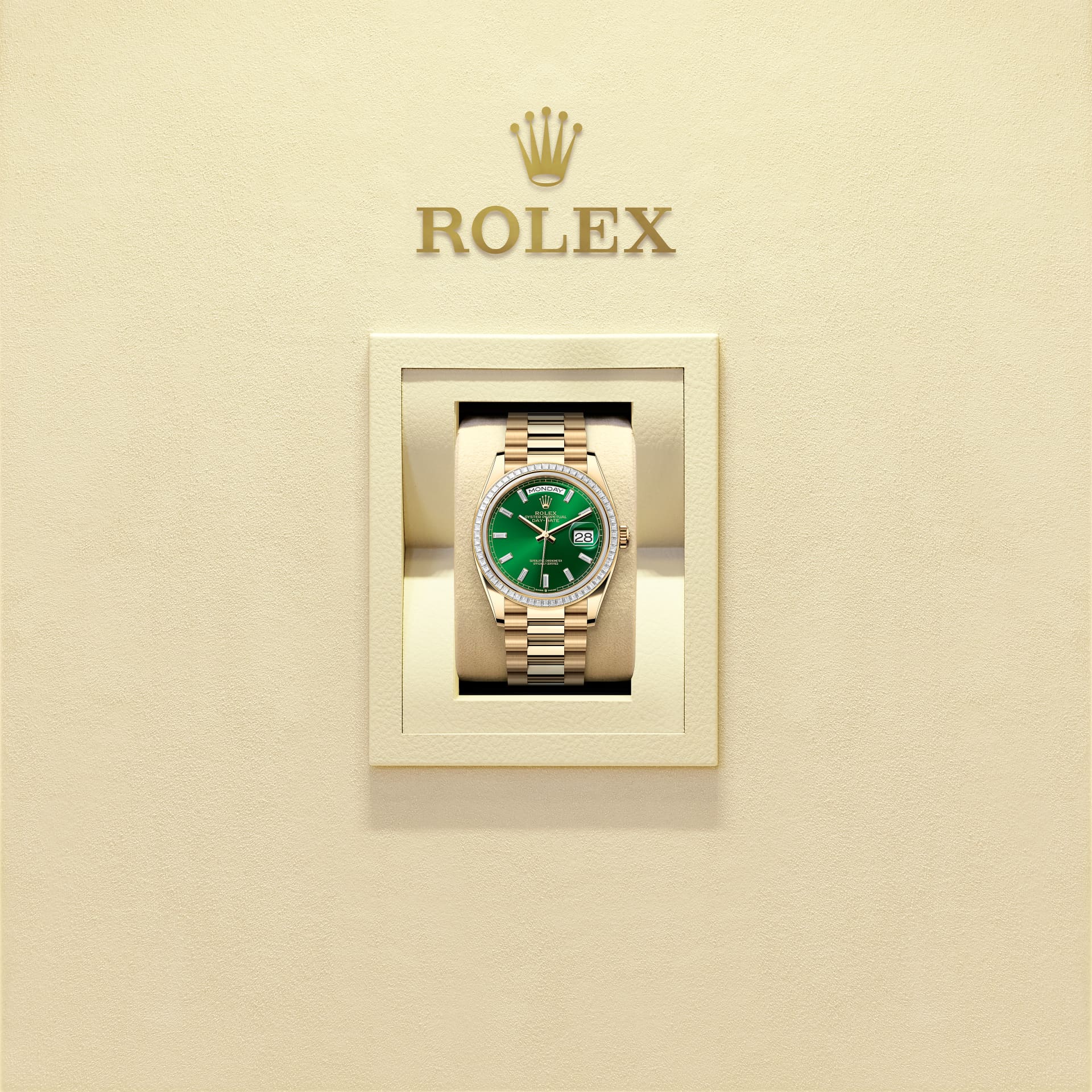 The Oyster Perpetual Day-Date 36 in 18 kt yellow gold, with a bright green, diamond-set dial, diamond-set bezel and a President bracelet.