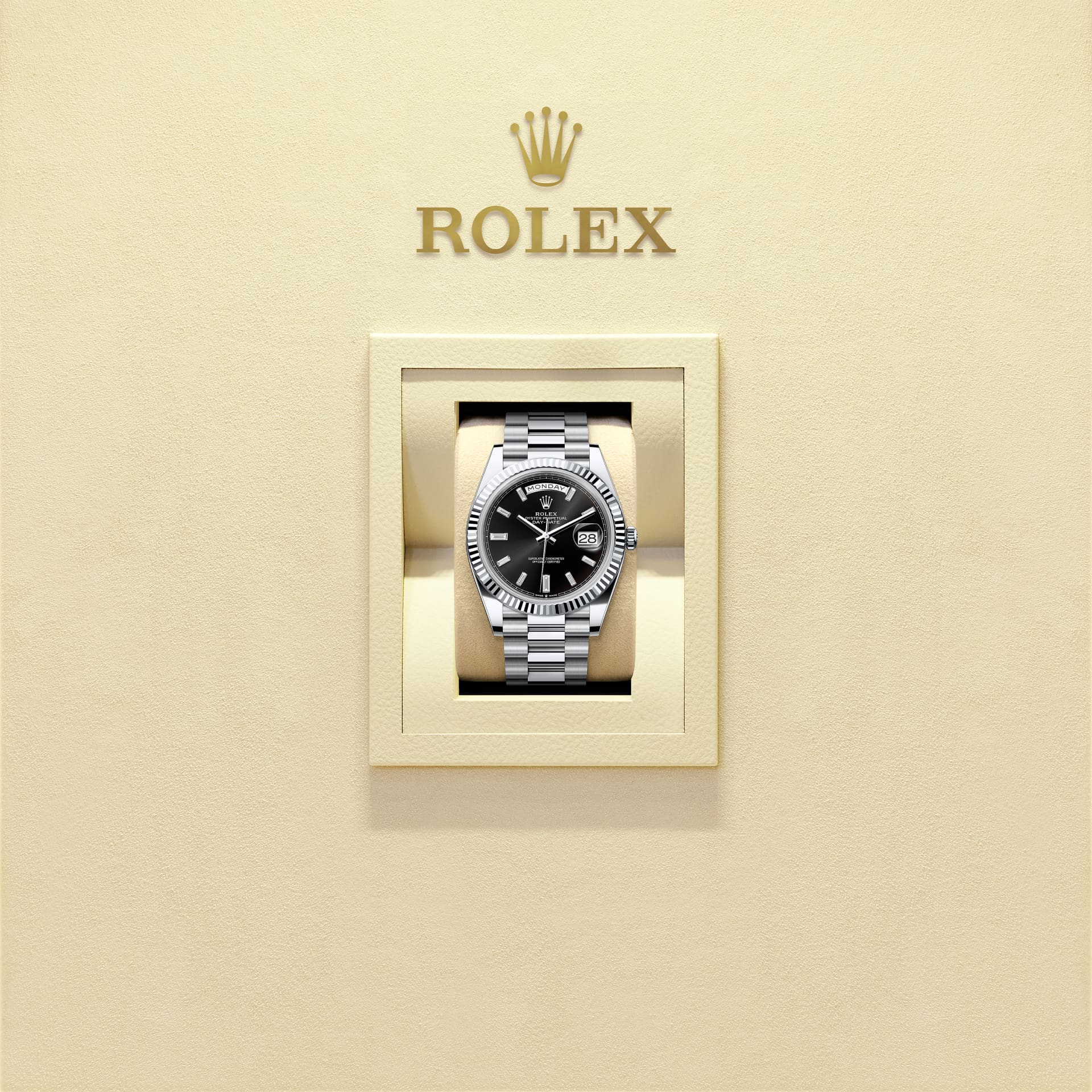The Oyster Perpetual Day-Date 40 in platinum with a bright black, diamond-set dial, fluted bezel and a President bracelet.