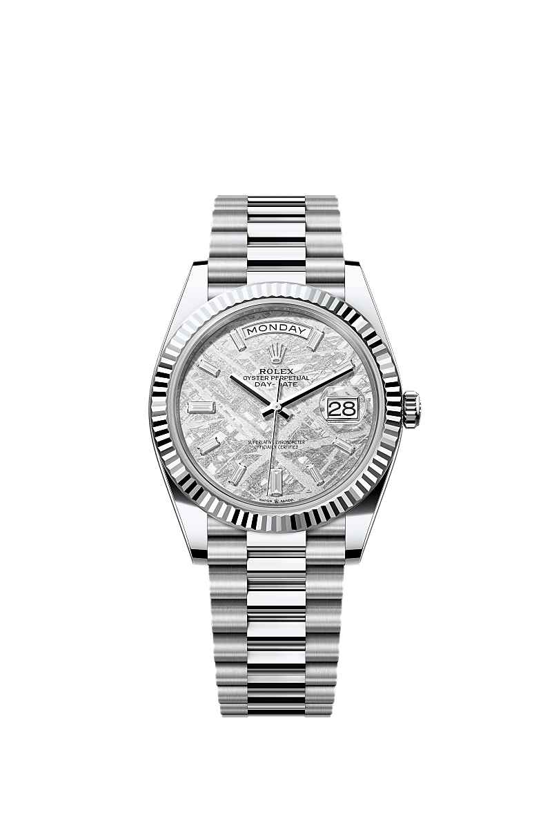 The Oyster Perpetual Day-Date 40 in platinum with a meteorite, diamond-set dial, fluted bezel and a President bracelet.