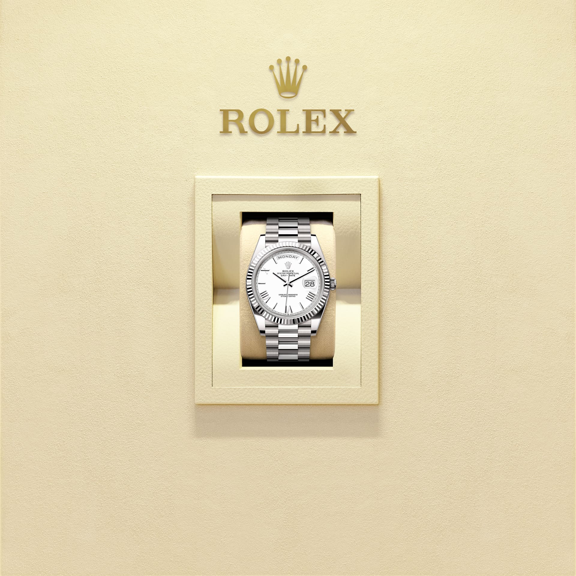 The Oyster Perpetual Day-Date 40 in 18 kt white gold with a white dial, fluted bezel and a President bracelet.