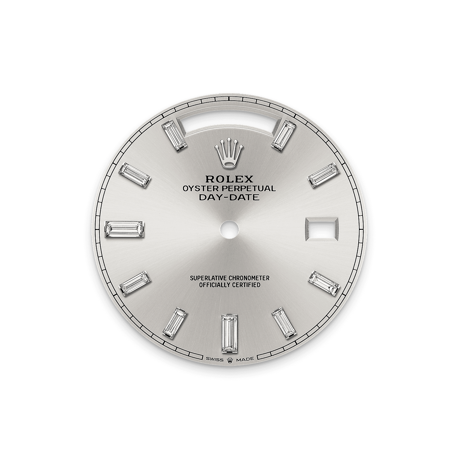 The Oyster Perpetual Day-Date 40 in platinum, with a silver, diamond-set dial, diamond-set bezel and a President bracelet.