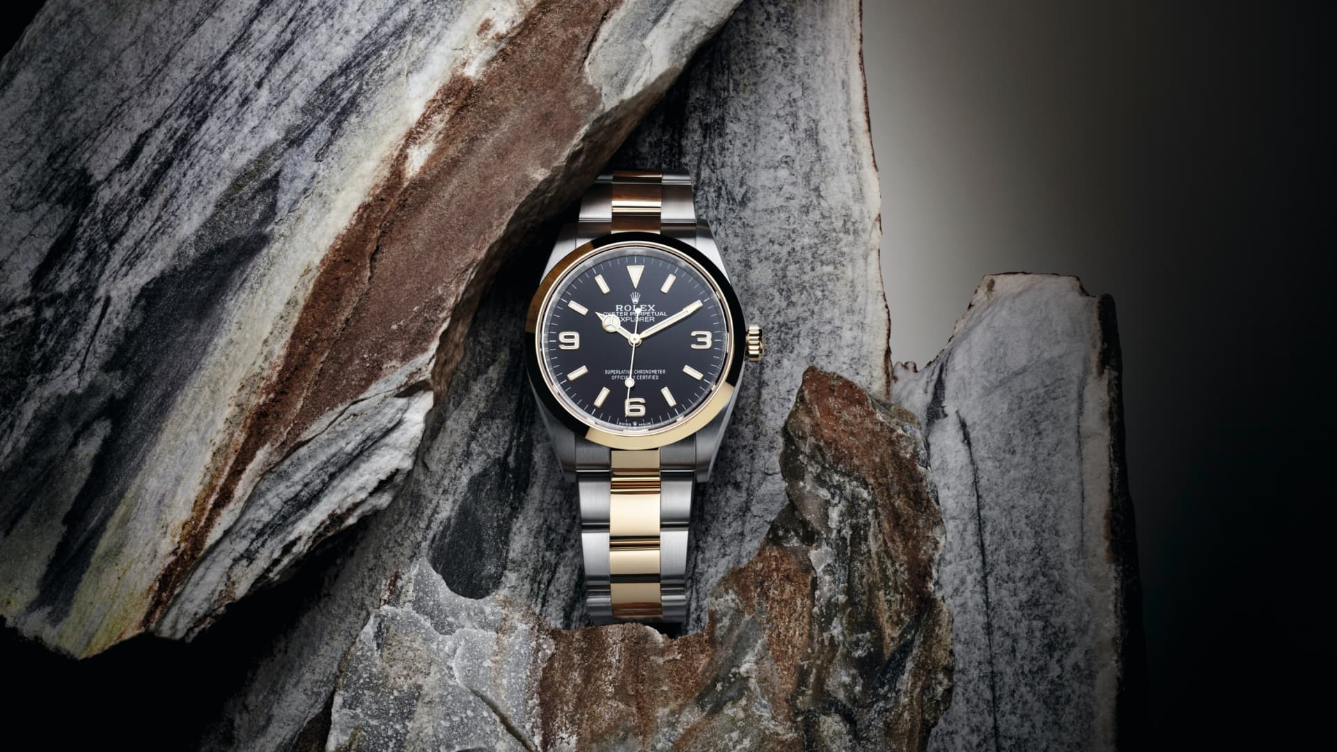 The Oyster Perpetual Explorer 36 in Oystersteel and yellow gold features a distinctive black dial with characteristic 3, 6, and 9 numerals with a Chromalight display.