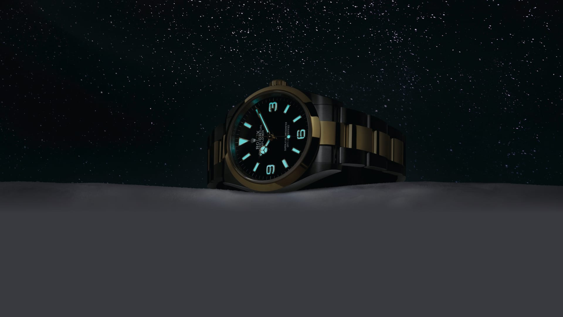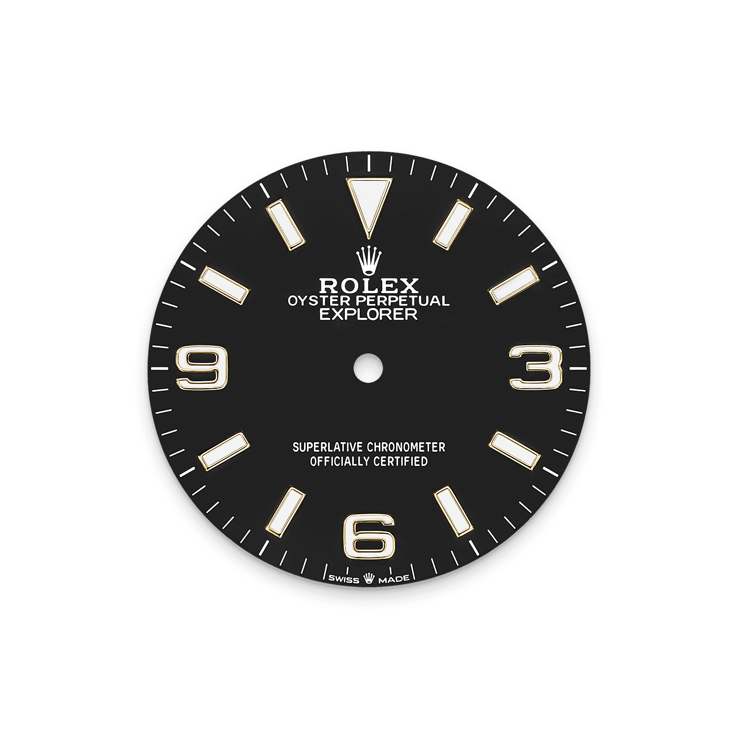 The dial is the distinctive face of a Rolex watch, the feature most responsible for its identity and readability. The Explorer model’s characteristic 3, 6 and 9 numerals are filled with a luminescent material emitting a long-lasting blue glow, like the hour markers and hands.