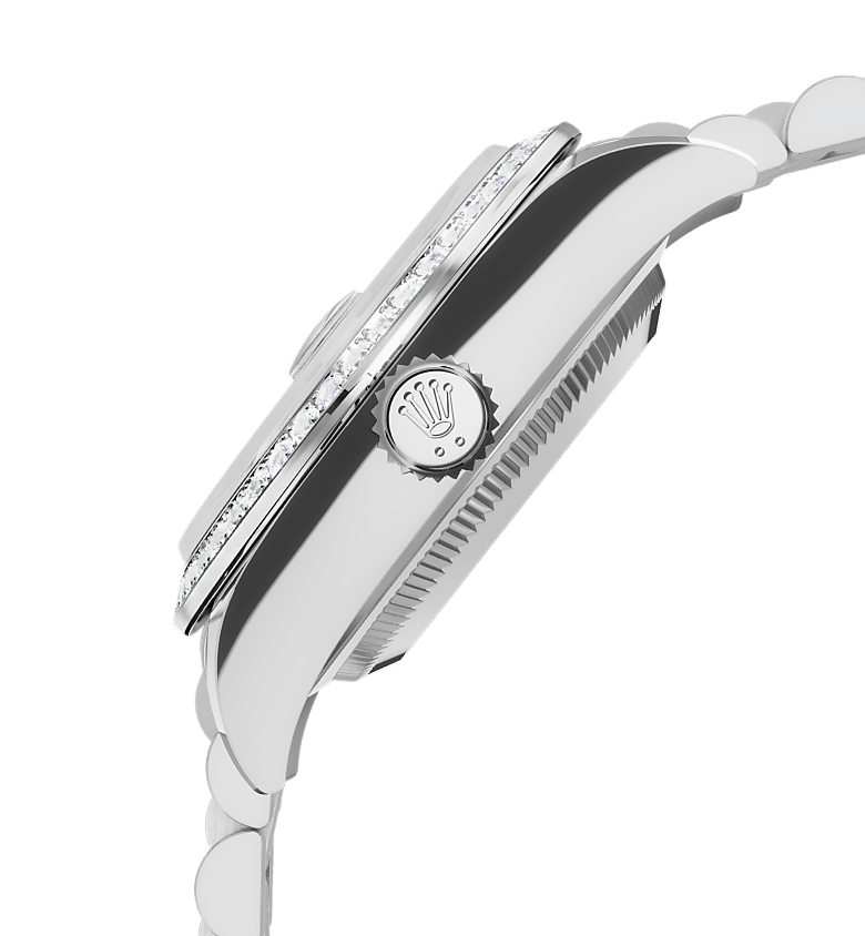This Lady-Datejust is offered on a prestigious President bracelet. Always in solid gold or platinum, the bracelets benefit from a concealed attachment beneath the bezel which ensures seamless visual continuity between the bracelet and case.