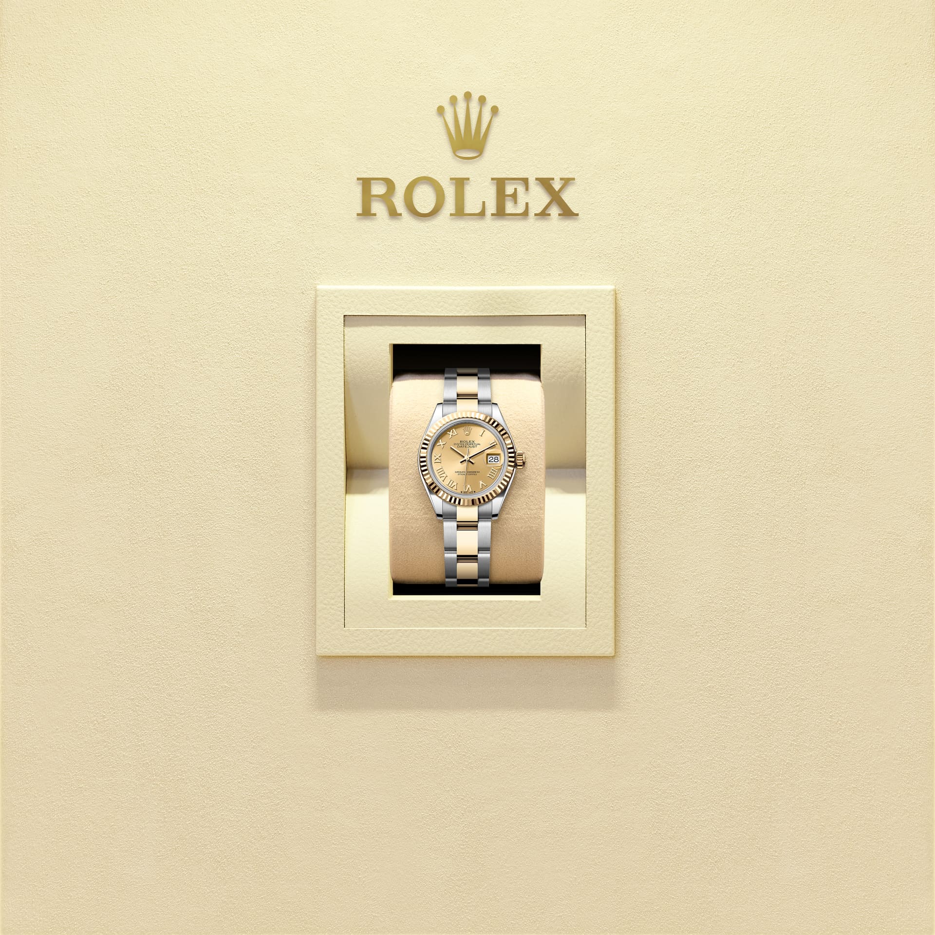 This Oyster Perpetual Lady-Datejust in Oystersteel and yellow gold features a champagne-colour dial and an Oyster bracelet.