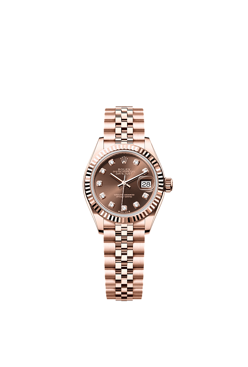 This Oyster Perpetual Lady-Datejust in 18 kt Everose gold features a chocolate, diamond-set dial and a Jubilee bracelet.