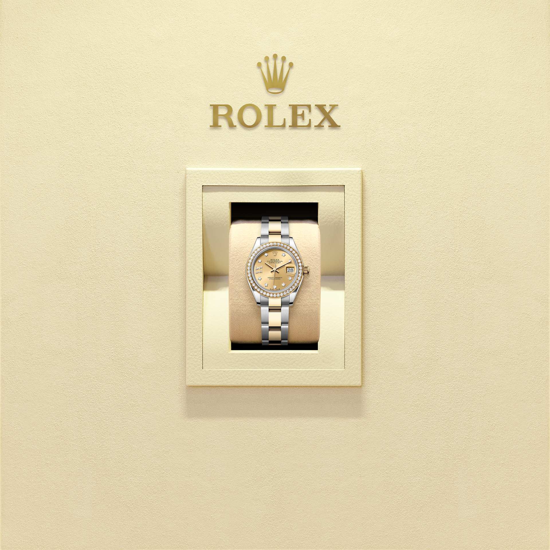 This Oyster Perpetual Lady-Datejust in Oystersteel and yellow gold features a champagne colour, diamond-set dial and an Oyster bracelet.