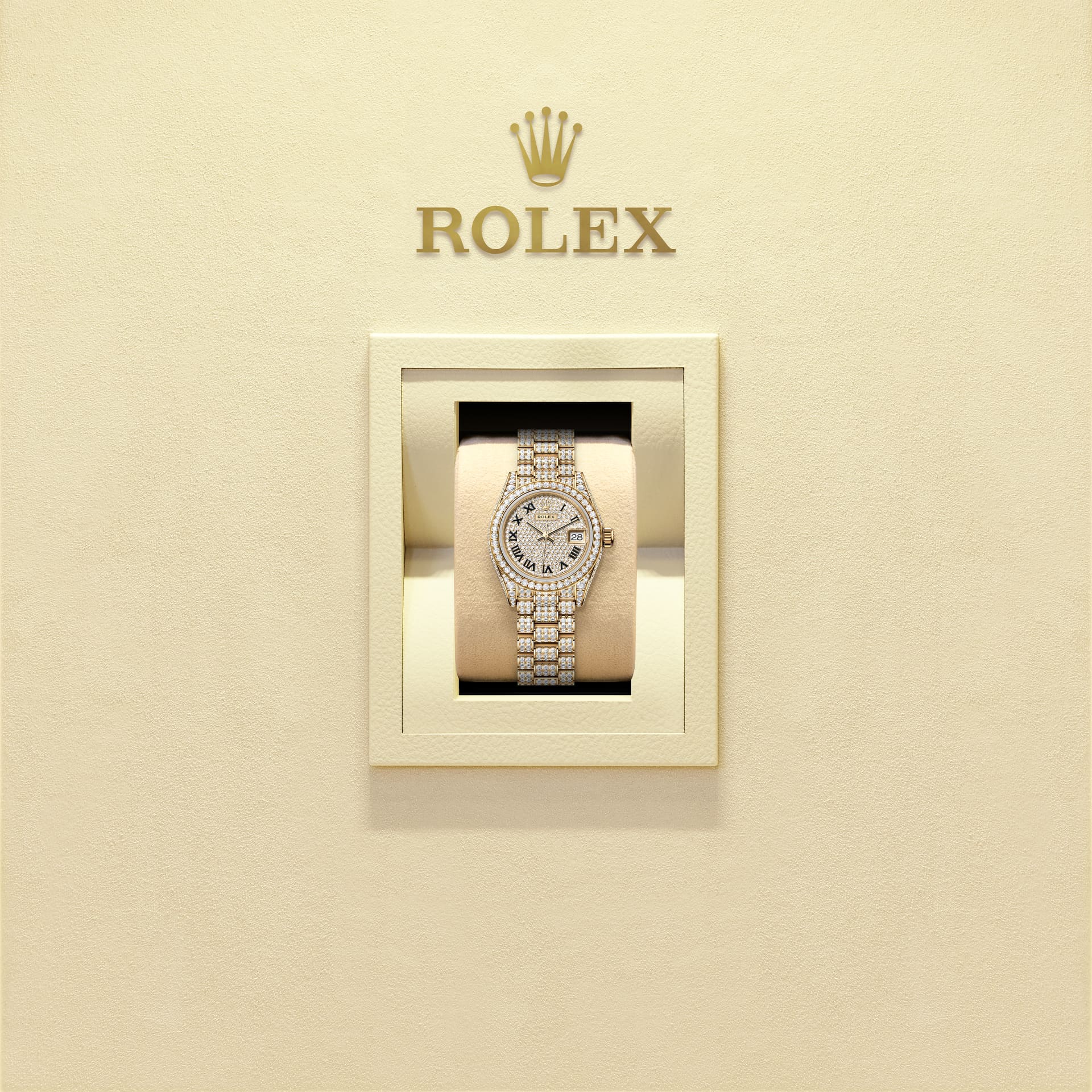 This Oyster Perpetual Lady-Datejust in 18 kt yellow gold features a diamond-paved dial and a diamond-set President bracelet.