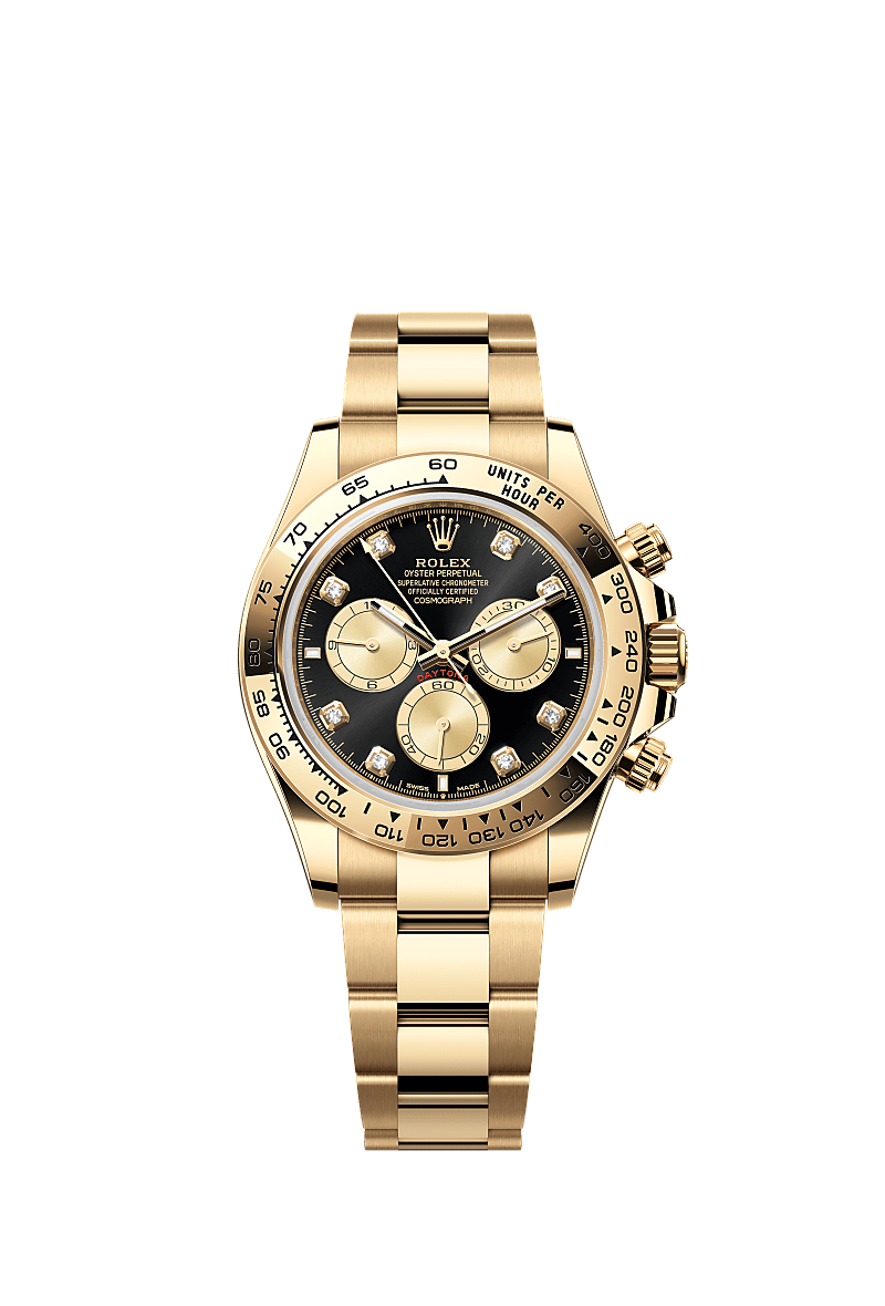 This Oyster Perpetual Cosmograph Daytona in 18 ct yellow gold, with a bright black and golden, diamond-set dial and an Oyster bracelet, features an 18 ct yellow gold bezel with an engraved tachymetric scale.