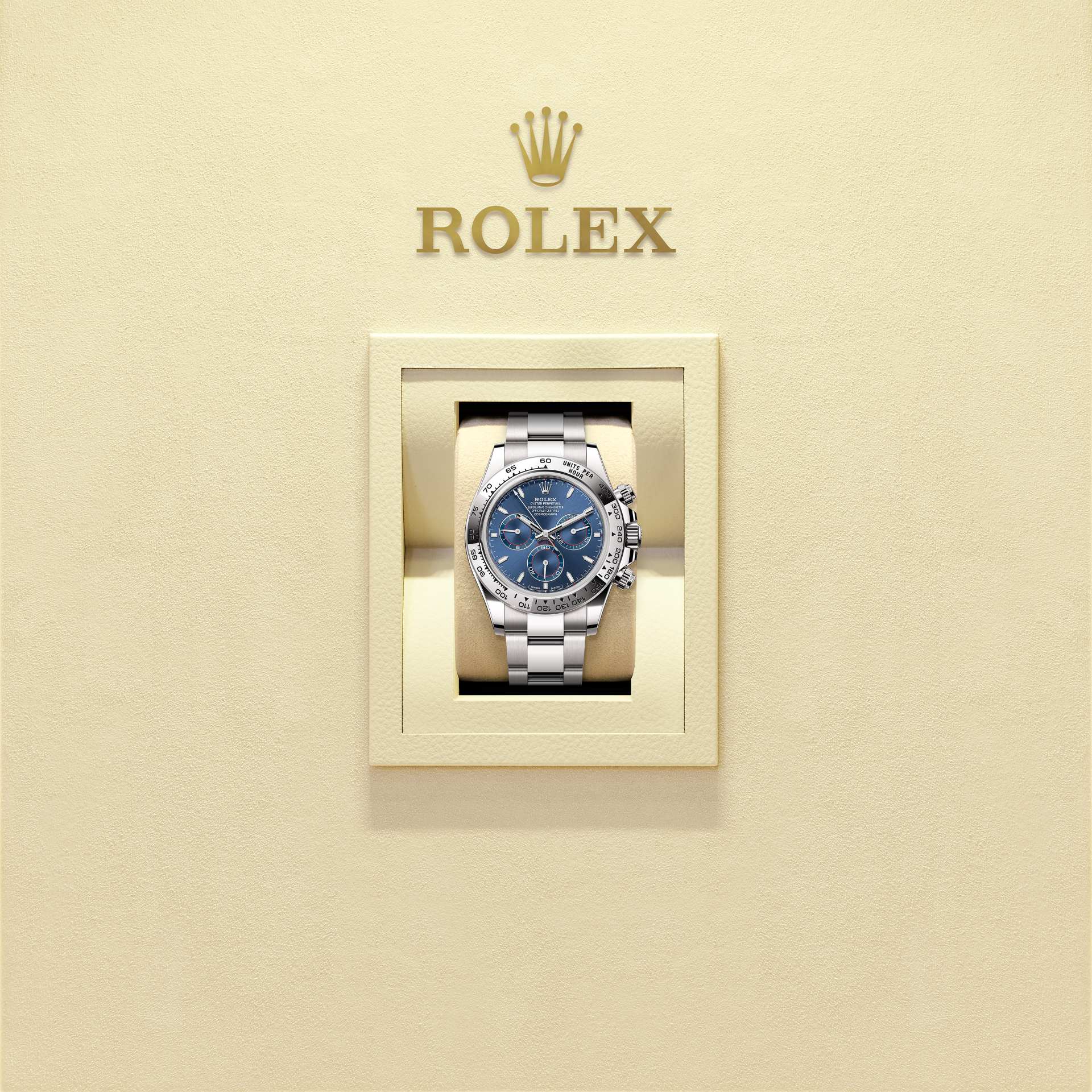 This Oyster Perpetual Cosmograph Daytona in 18 ct white gold, with a bright blue dial and an Oyster bracelet, features an 18 ct white gold bezel with an engraved tachymetric scale.