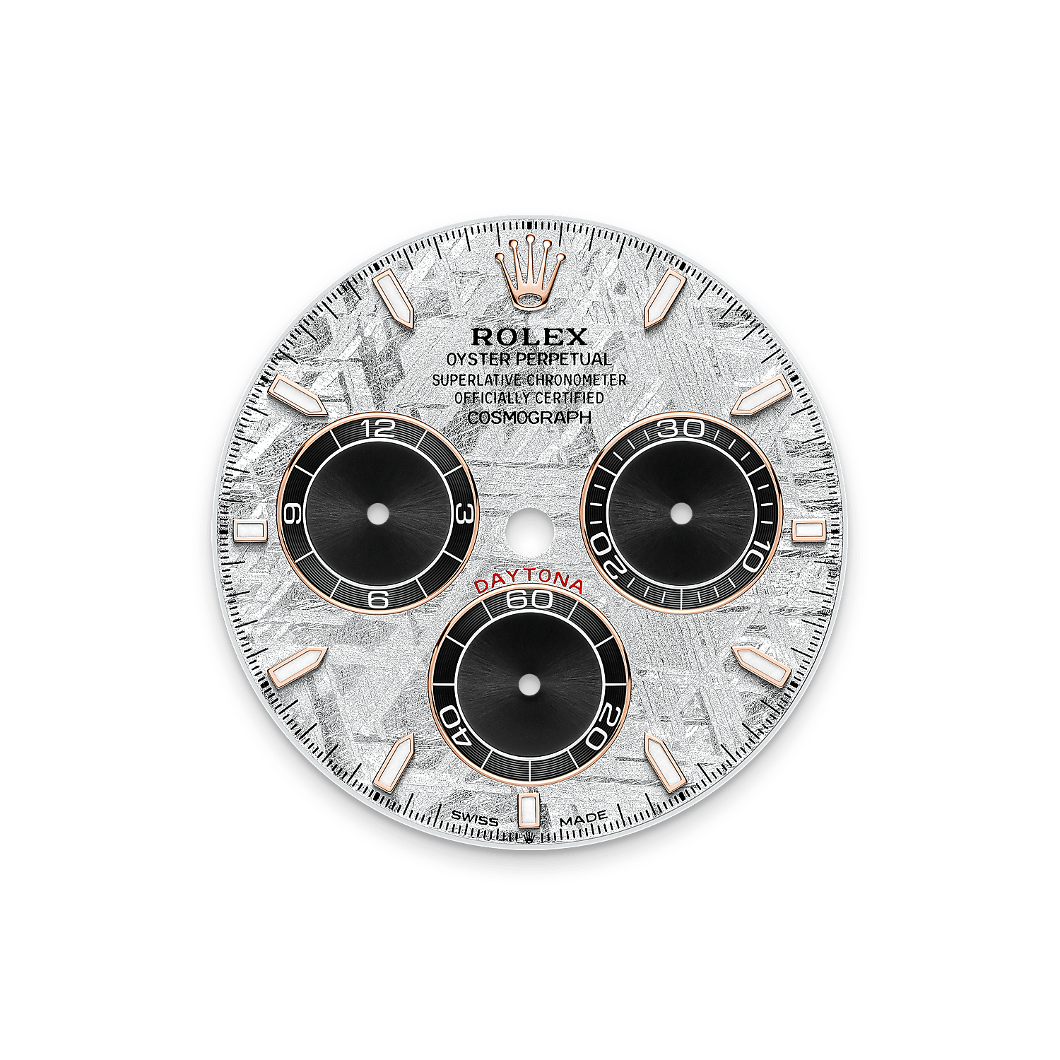 This model is the only Cosmograph Daytona with a meteorite dial. Meteorite comes from the heart of an asteroid or possibly even a planet that has exploded, propelling material across the Solar System until chance brings it into our planet’s orbit and gravity pulls it to Earth.