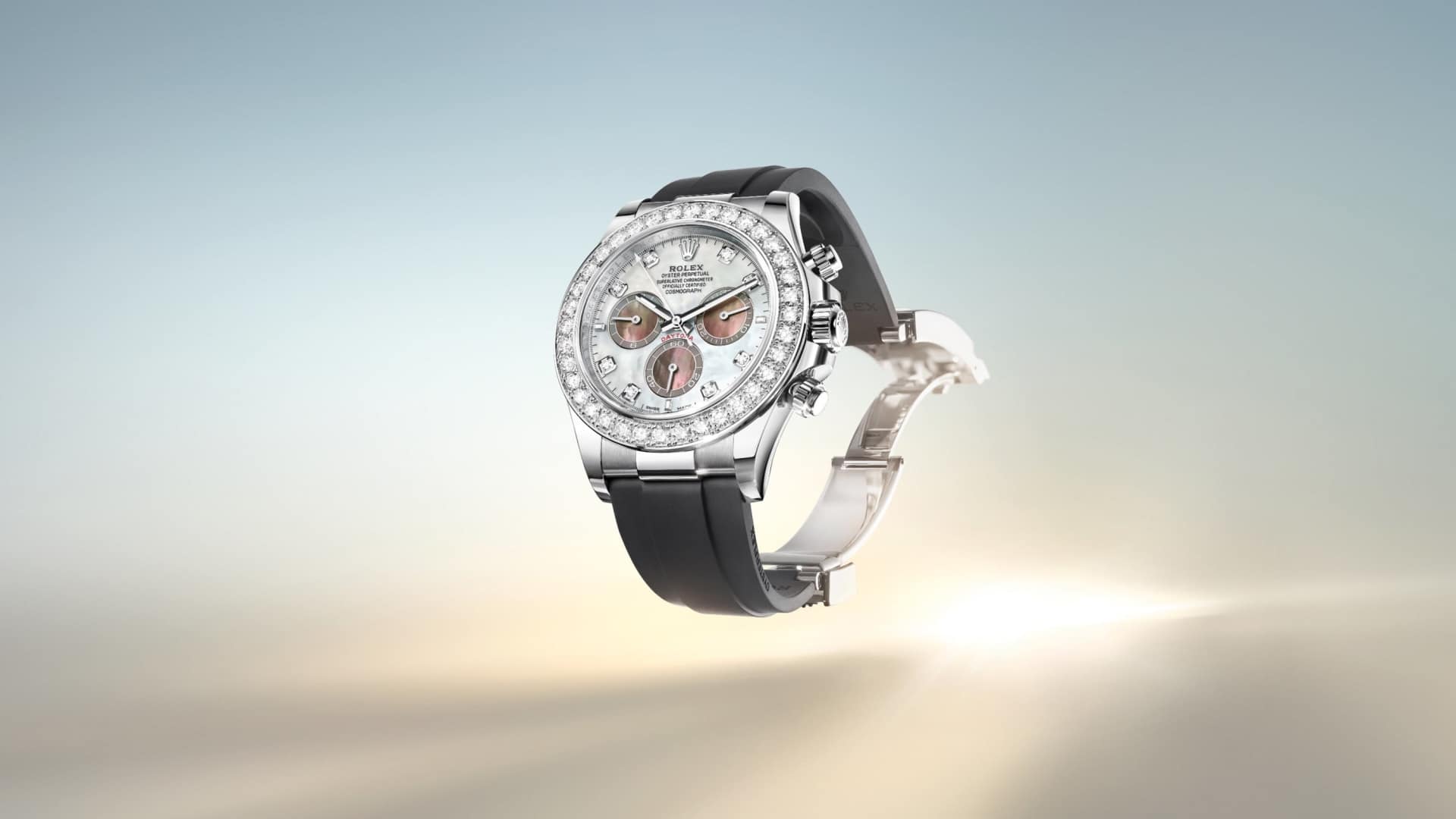 This Oyster Perpetual Cosmograph Daytona in 18 ct white gold, with a white and black mother-of-pearl, diamond-set dial and an Oysterflex bracelet, features a diamond-set bezel.
