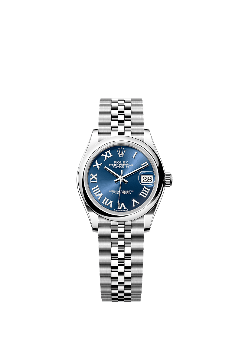 This Oyster Perpetual Datejust 31 in Oystersteel features a bright blue dial and a Jubilee bracelet.