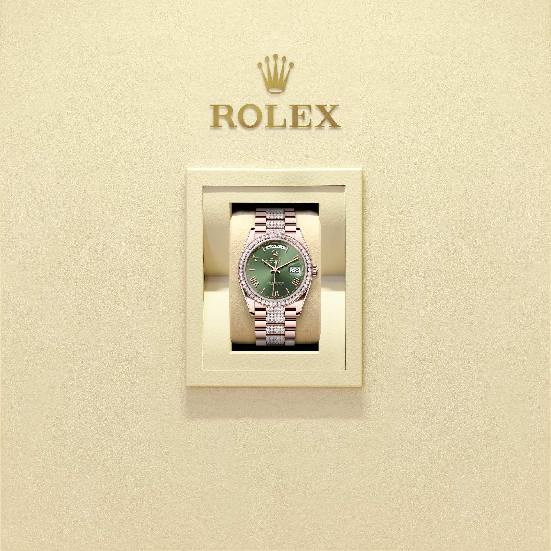 The Oyster Perpetual Day-Date 36 in 18 ct Everose gold with an olive-green dial, diamond-set bezel and a diamond-set President bracelet.
