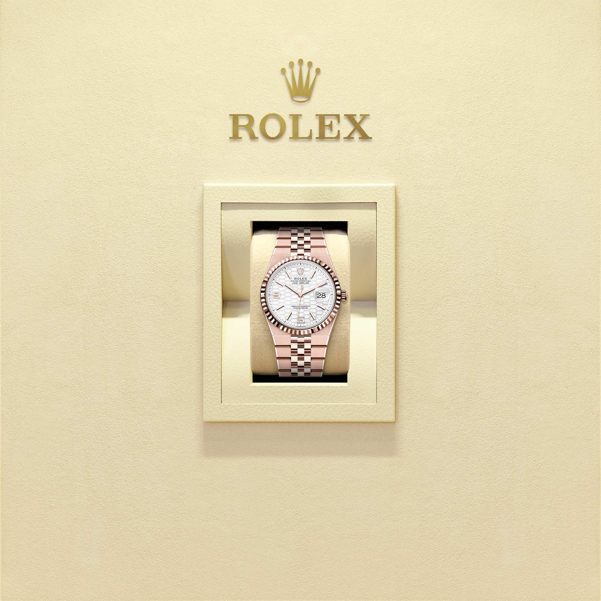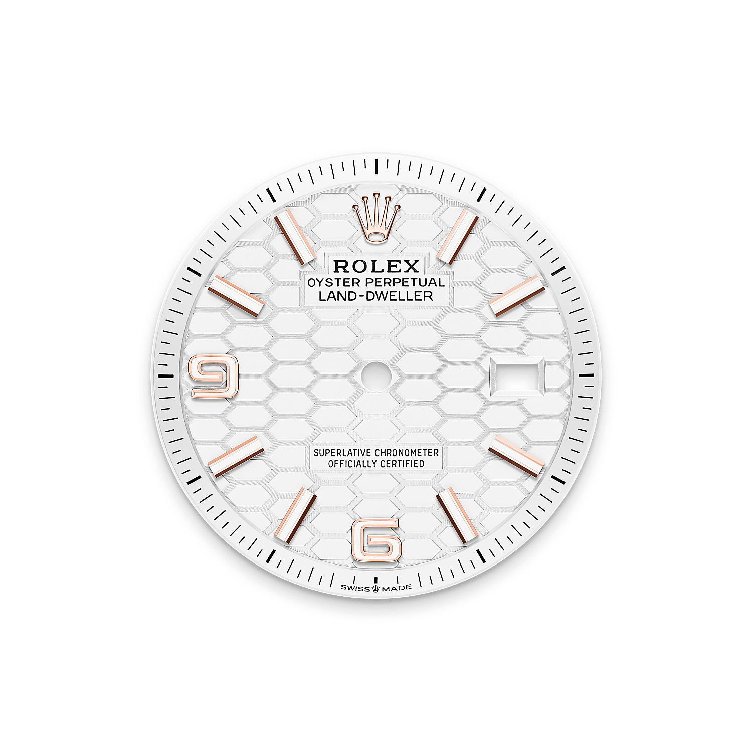 The Land-Dweller 36 in 18 ct Everose gold with an intense white, honeycomb-motif dial and Flat Jubilee bracelet.