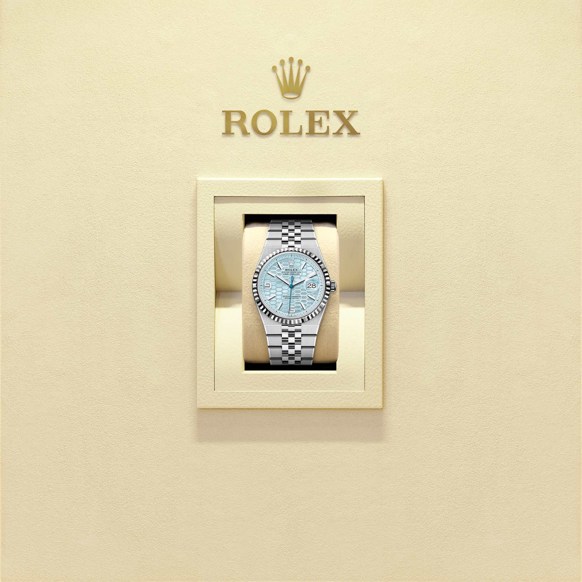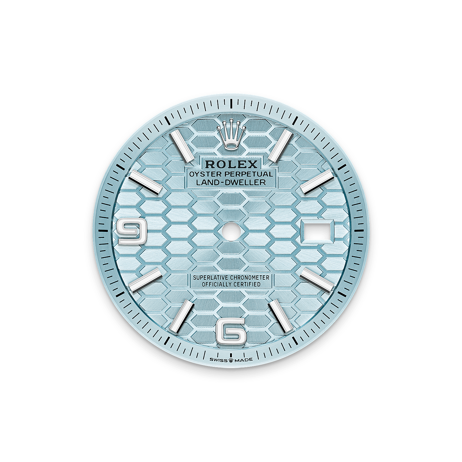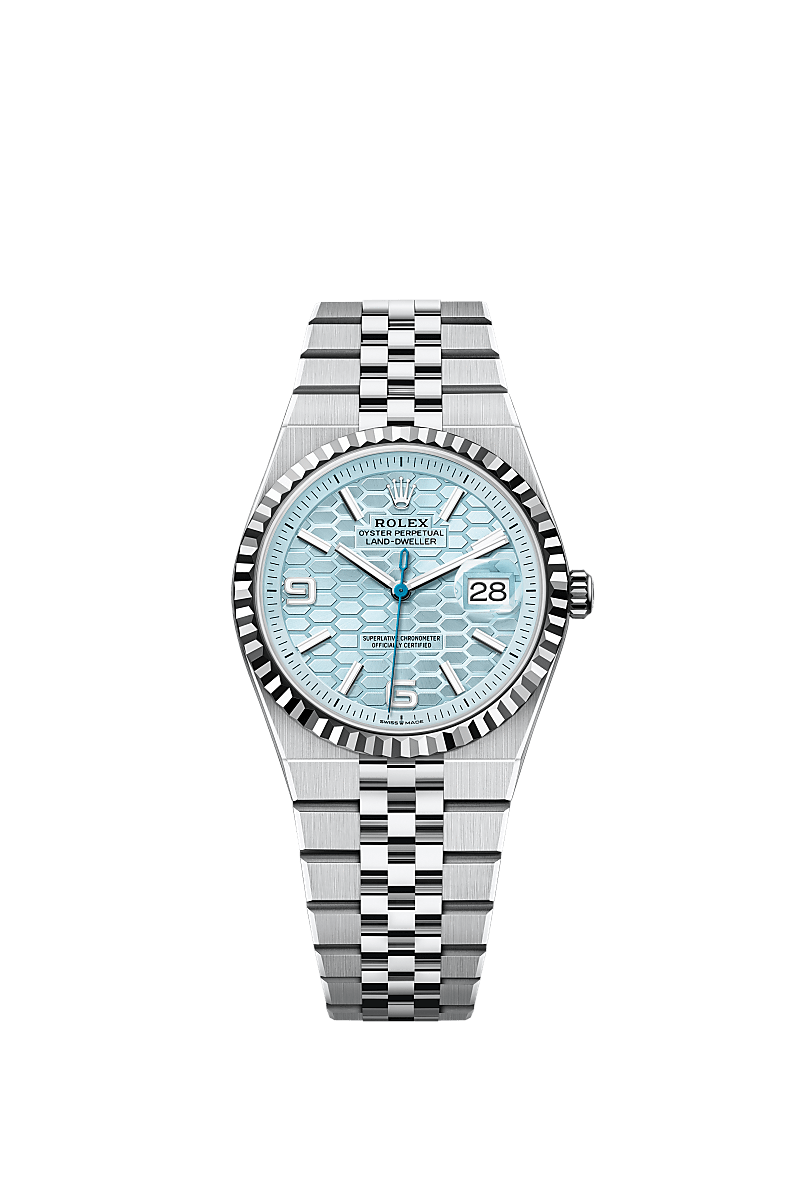 The Land-Dweller 36 in platinum with an ice-blue, honeycomb-motif dial and Flat Jubilee bracelet.