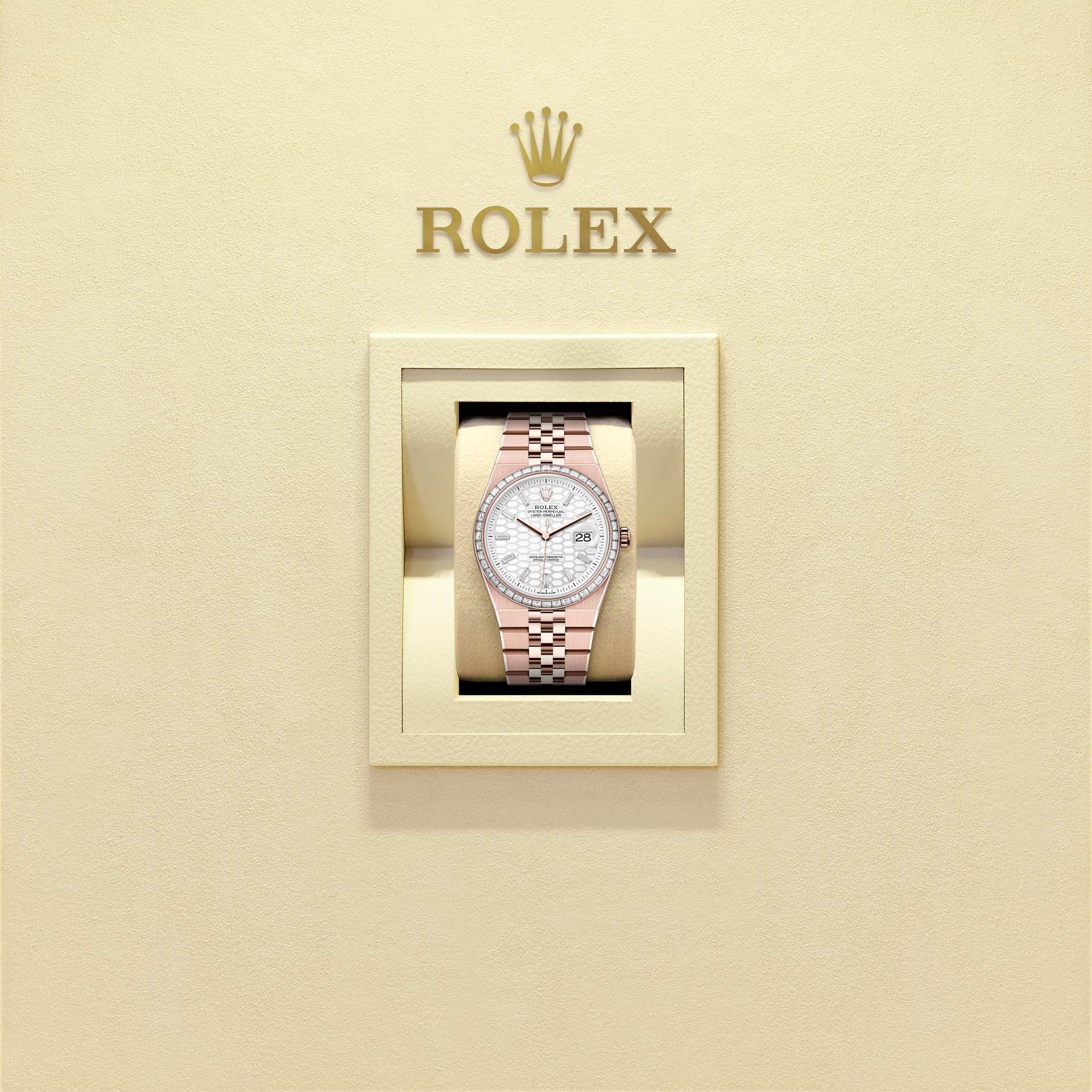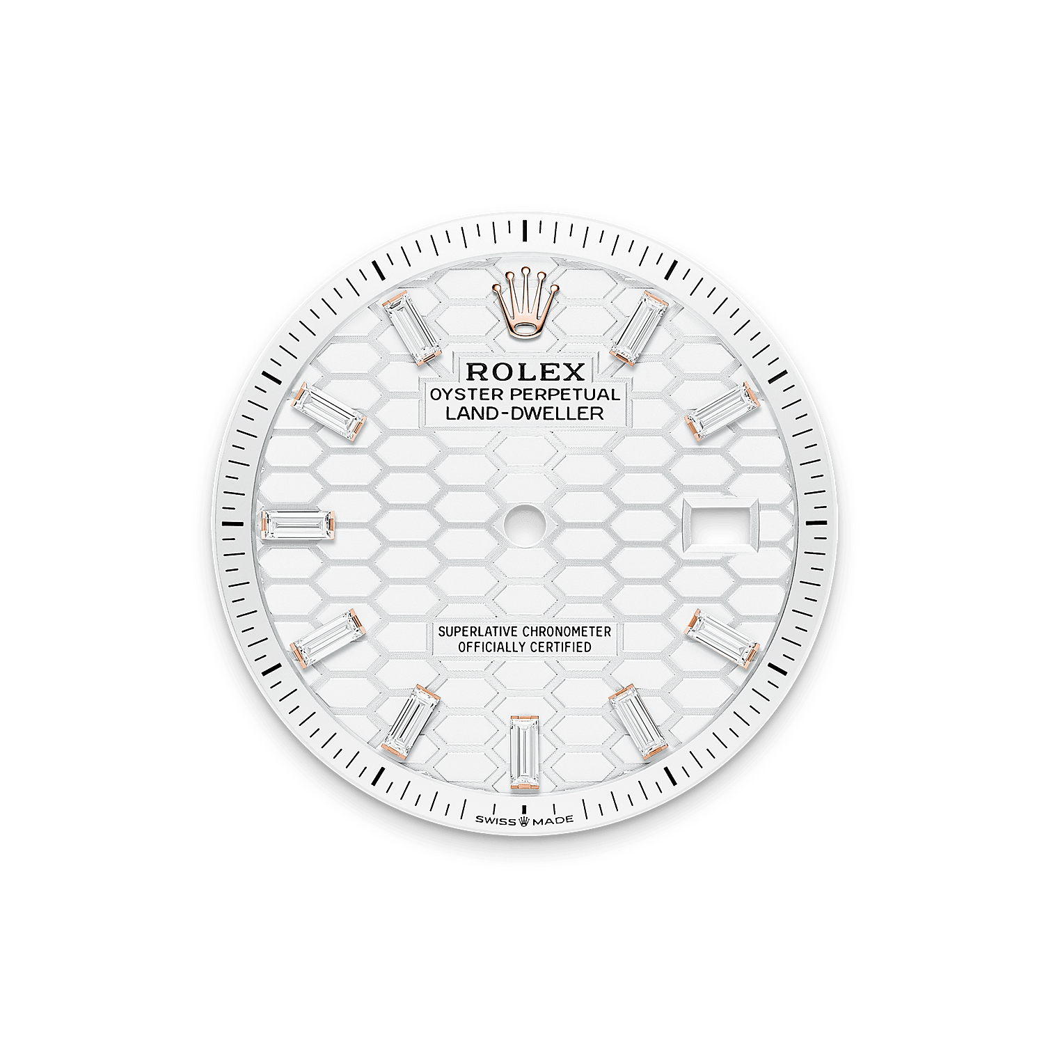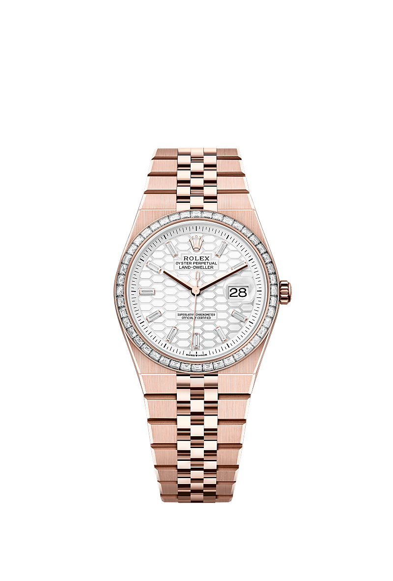 The Land-Dweller 36 in 18 ct Everose gold with an intense white, honeycomb-motif, diamond-set dial and Flat Jubilee bracelet.