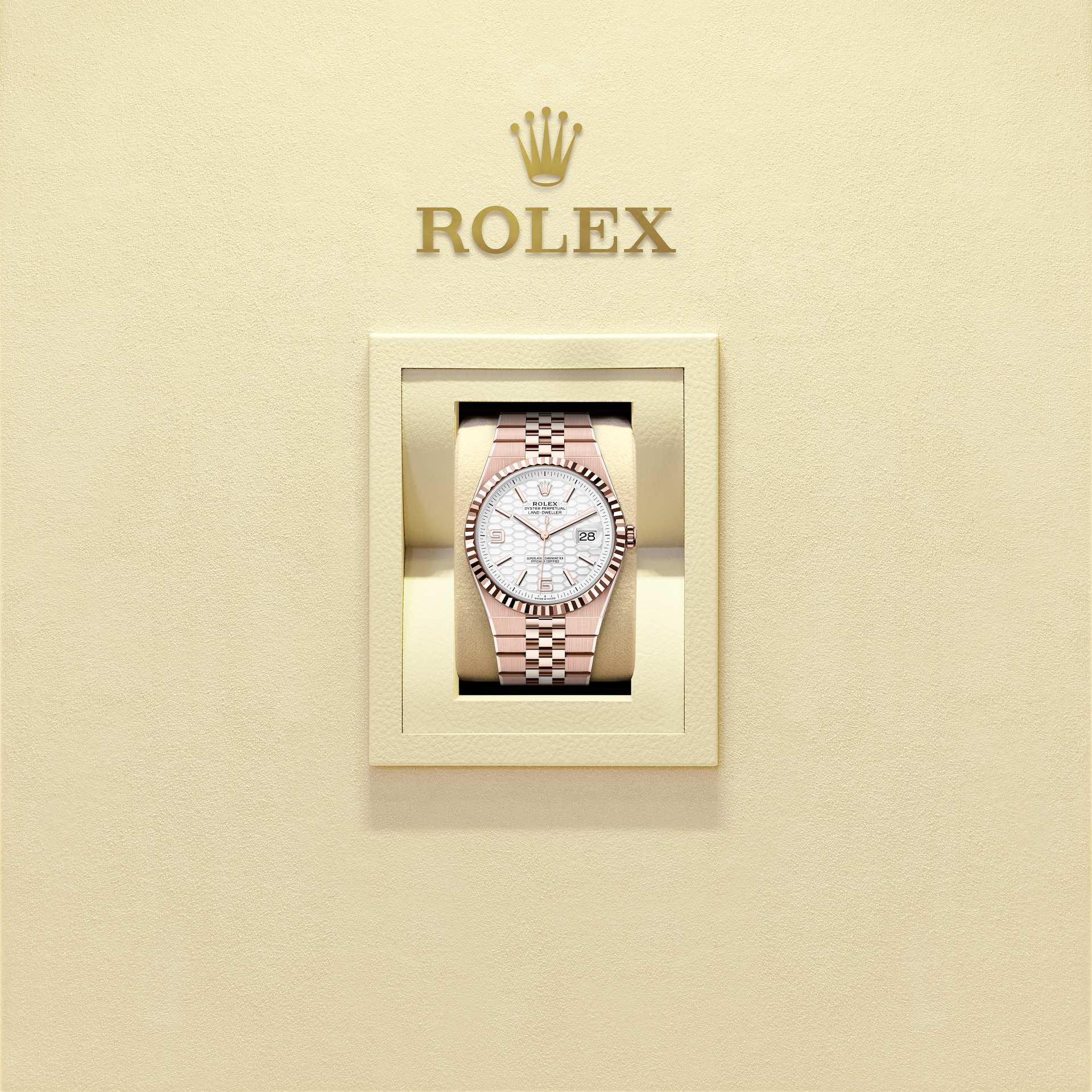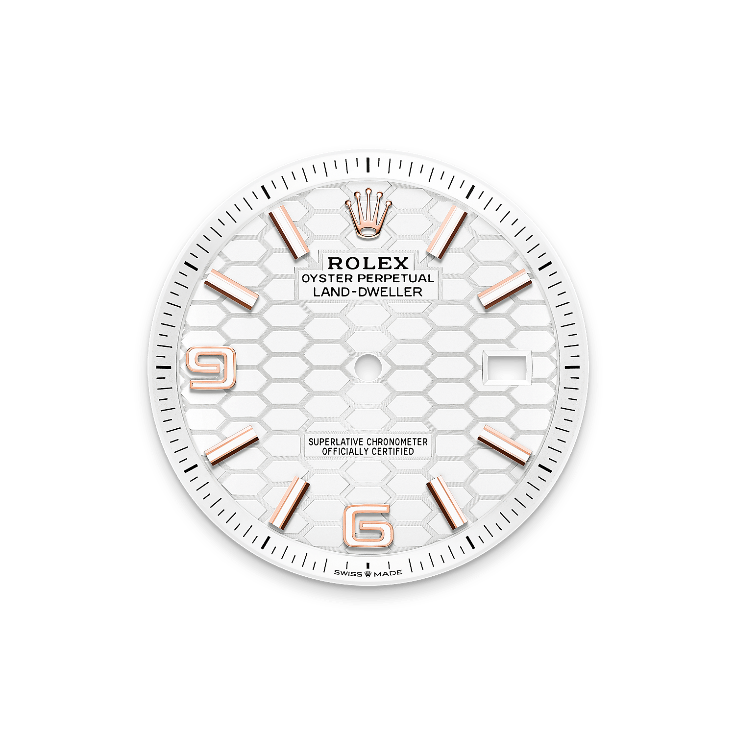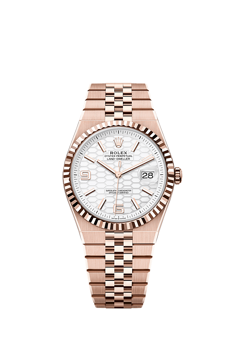 The Land-Dweller 40 in 18 ct Everose gold with an intense white, honeycomb-motif dial and Flat Jubilee bracelet.